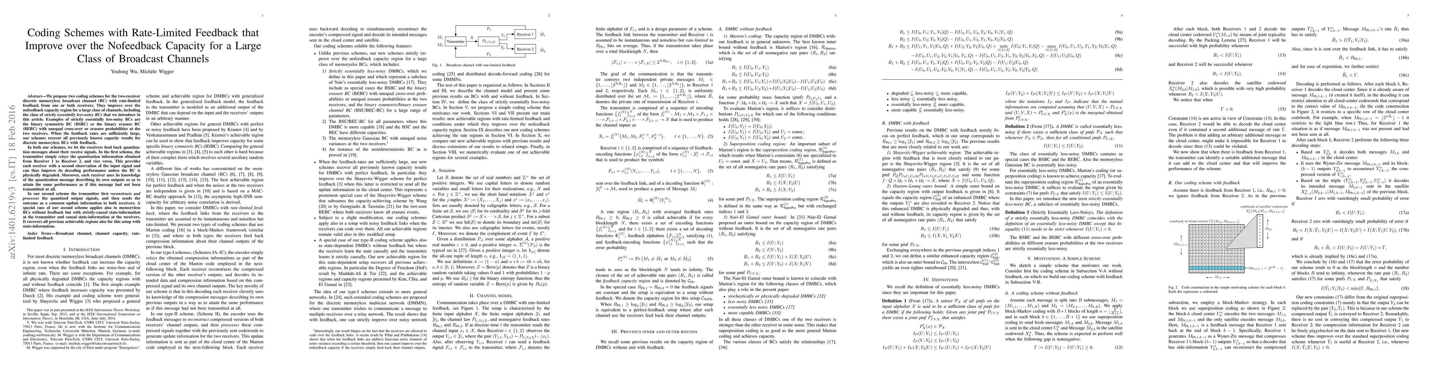 We propose two coding schemes for the two-receiver discrete memoryless broadcast channel (BC) with rate-limited feedback from one or both receivers. They improve over the nofeedback capacity region for a large class of channels, including the class of \emph{strictly essentially less-noisy BCs} that we introduce in this article. Examples of strictly essentially less-noisy BCs are the binary symmetric BC (BSBC) or the binary erasure BC (BEBC) with unequal cross-over or erasure probabilities at the two receivers. When the feedback rates are sufficiently large, our schemes recover all previously known capacity results for discrete memoryless BCs with feedback. In both our schemes, we let the receivers feed back quantization messages about their receive signals. In the first scheme, the transmitter simply \emph{relays} the quantization information obtained from Receiver 1 to Receiver 2, and vice versa. This provides each receiver with a second observation of the input signal and can thus improve its decoding performance unless the BC is physically degraded. Moreover, each receiver uses its knowledge of the quantization message describing its own outputs so as to attain the same performance as if this message had not been transmitted at all. In our second scheme the transmitter first \emph{reconstructs and processes} the quantized output signals, and then sends the outcome as a common update information to both receivers. A special case of our second scheme applies also to memoryless BCs without feedback but with strictly-causal state-information at the transmitter and causal state-information at the receivers. It recovers all previous achievable regions also for this setup with state-information.