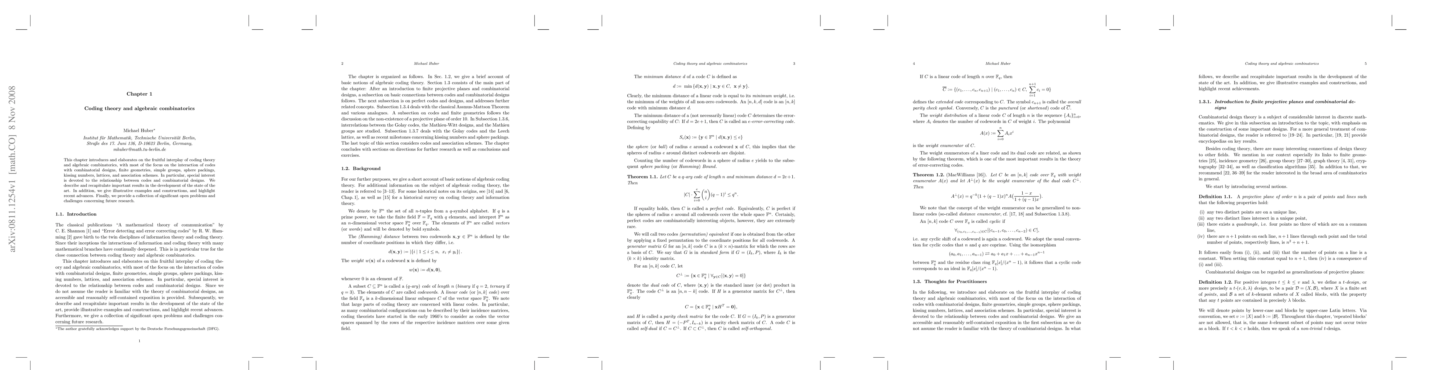 This chapter explores the connection between coding theory and algebraic combinatorics, focusing on codes and combinatorial designs, with a review of recent advances and open problems.