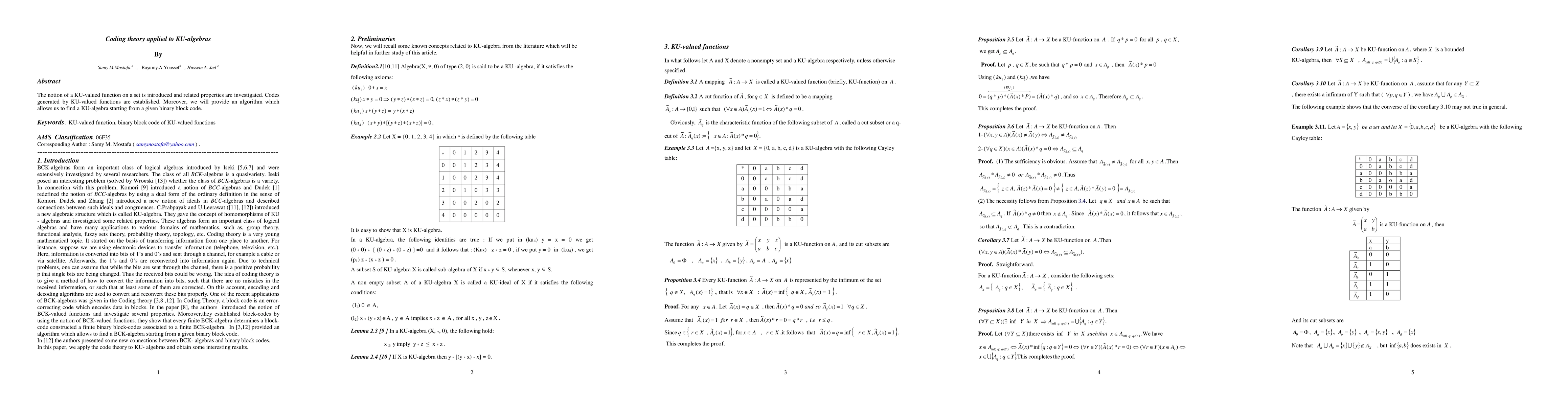 This paper introduces KU-valued functions on sets and explores their coding properties, establishing codes generated by these functions. It also presents an algorithm for deriving a KU-algebra from a given binary block code.