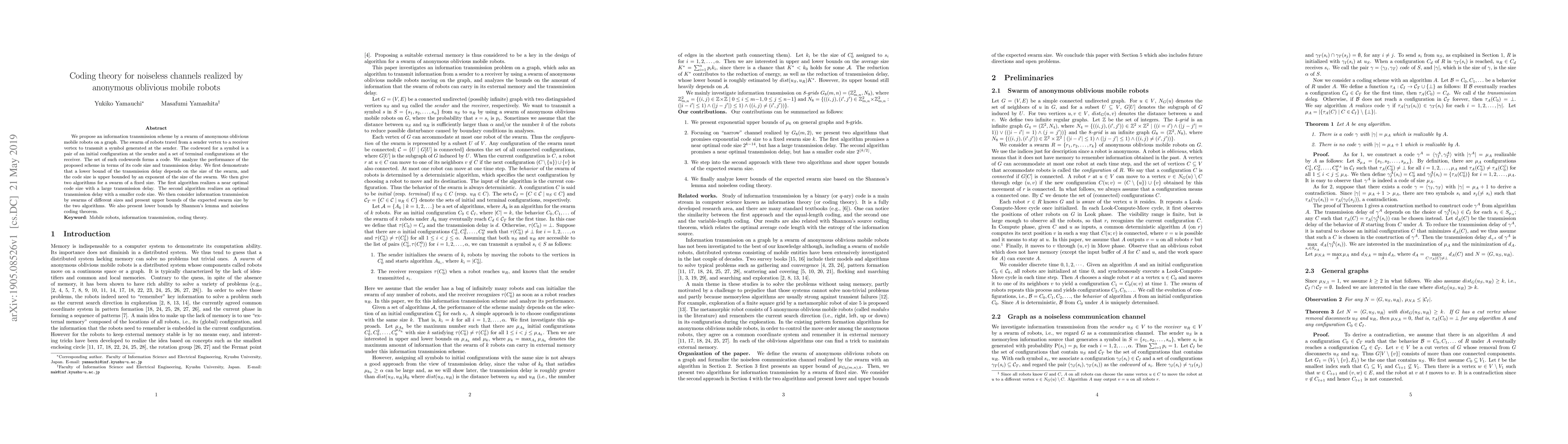 We propose an information transmission scheme by a swarm of anonymous oblivious mobile robots on a graph. The swarm of robots travel from a sender vertex to a receiver vertex to transmit a symbol generated at the sender. The codeword for a symbol is a pair of an initial configuration at the sender and a set of terminal configurations at the receiver. The set of such codewords forms a code. We analyze the performance of the proposed scheme in terms of its code size and transmission delay. We first demonstrate that a lower bound of the transmission delay depends on the size of the swarm, and the code size is upper bounded by an exponent of the size of the swarm. We then give two algorithms for a swarm of a fixed size. The first algorithm realizes a near optimal code size with a large transmission delay. The second algorithm realizes an optimal transmission delay with a smaller code size. We then consider information transmission by swarms of different sizes and present upper bounds of the expected swarm size by the two algorithms. We also present lower bounds by Shannon's lemma and noiseless coding theorem.