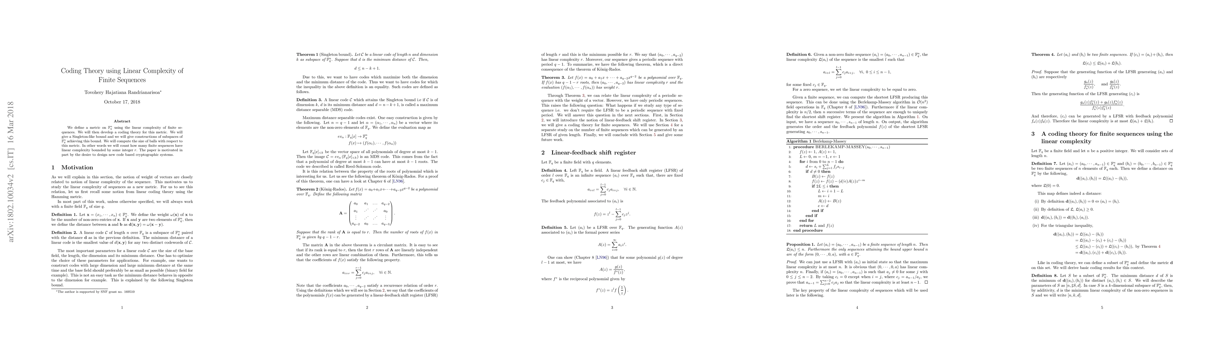 We define a metric on $\mathbb{F}_q^n$ using the linear complexity of finite sequences. We will then develop a coding theory for this metric. We will give a Singleton-like bound and we will give constructions of subspaces of $\mathbb{F}_q^n$ achieving this bound. We will compute the size of balls with respect to this metric. In other words we will count how many finite sequences have linear complexity bounded by some integer $r$. The paper is motivated in part by the desire to design new code based cryptographic systems.