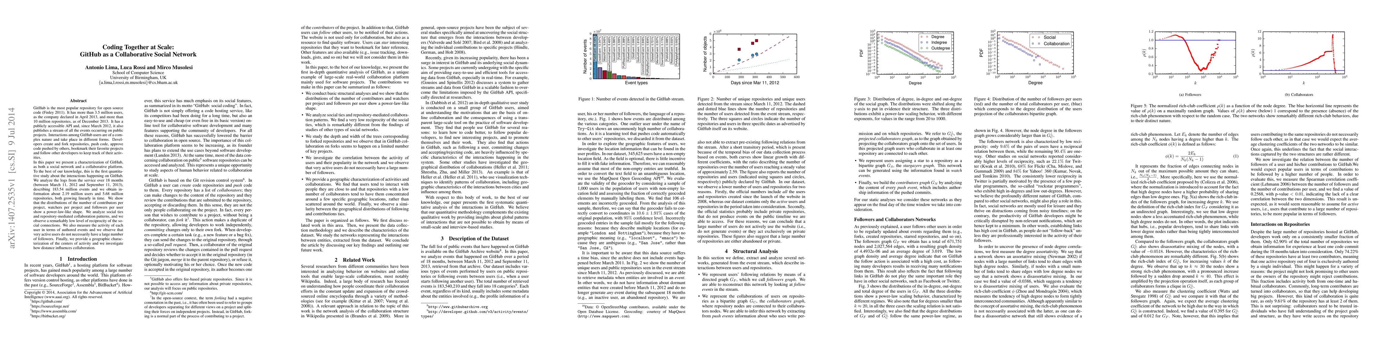 This paper quantitatively analyzes GitHub as a collaborative social network, examining 183.54 million events over 18 months. It reveals power-law-like distributions in contributors, watchers, and followers, low reciprocity in social connections, and geographic influences on collaboration.
