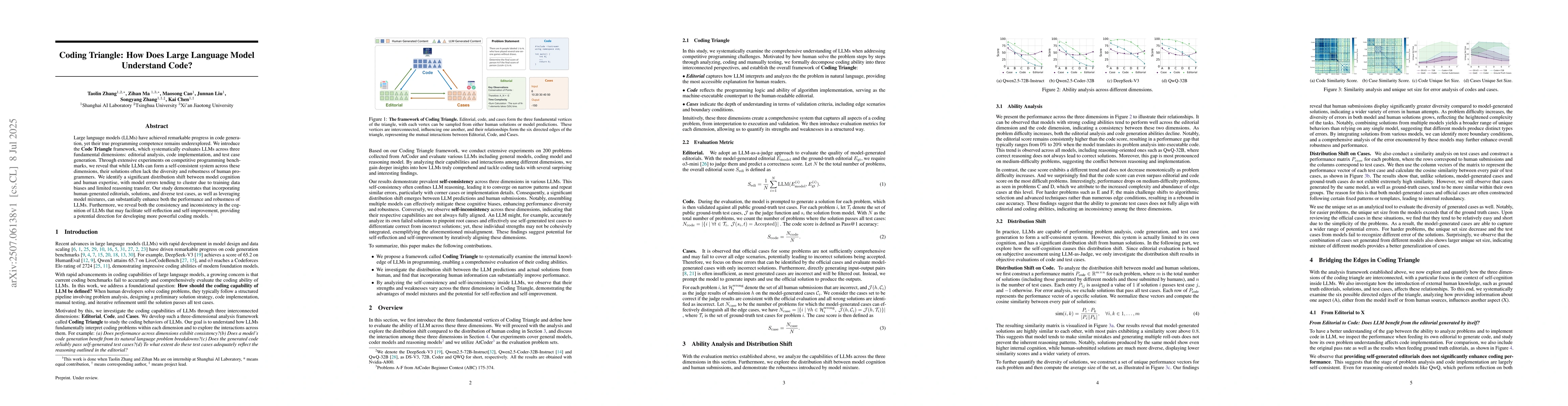 Large language models (LLMs) have achieved remarkable progress in code generation, yet their true programming competence remains underexplored. We introduce the Code Triangle framework, which systematically evaluates LLMs across three fundamental dimensions: editorial analysis, code implementation, and test case generation. Through extensive experiments on competitive programming benchmarks, we reveal that while LLMs can form a self-consistent system across these dimensions, their solutions often lack the diversity and robustness of human programmers. We identify a significant distribution shift between model cognition and human expertise, with model errors tending to cluster due to training data biases and limited reasoning transfer. Our study demonstrates that incorporating human-generated editorials, solutions, and diverse test cases, as well as leveraging model mixtures, can substantially enhance both the performance and robustness of LLMs. Furthermore, we reveal both the consistency and inconsistency in the cognition of LLMs that may facilitate self-reflection and self-improvement, providing a potential direction for developing more powerful coding models.