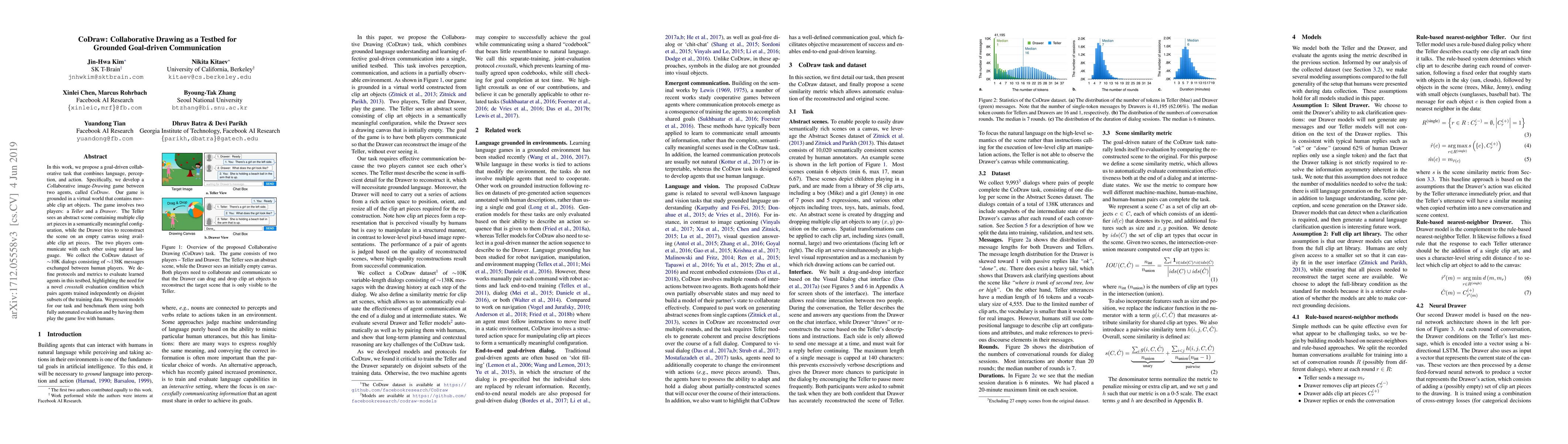 Researchers developed CoDraw, a collaborative drawing game to test goal-driven communication, and collected 10K dialogues with ~138K messages between human players to evaluate learned agents.
