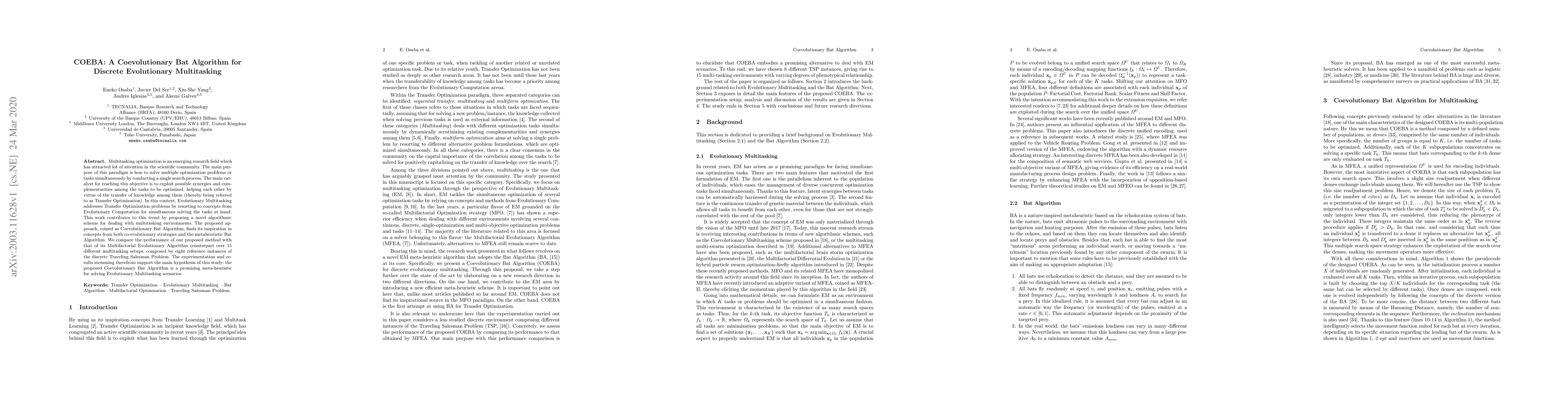The paper introduces the Coevolutionary Bat Algorithm (COEBA), a novel meta-heuristic combining co-evolutionary strategies and the Bat Algorithm to tackle discrete evolutionary multitasking. Experimental results show COEBA outperforms its Multifactorial Evolutionary Algorithm counterpart on various instances of the Traveling Salesman Problem, supporting its efficacy in solving multitasking optimization problems.