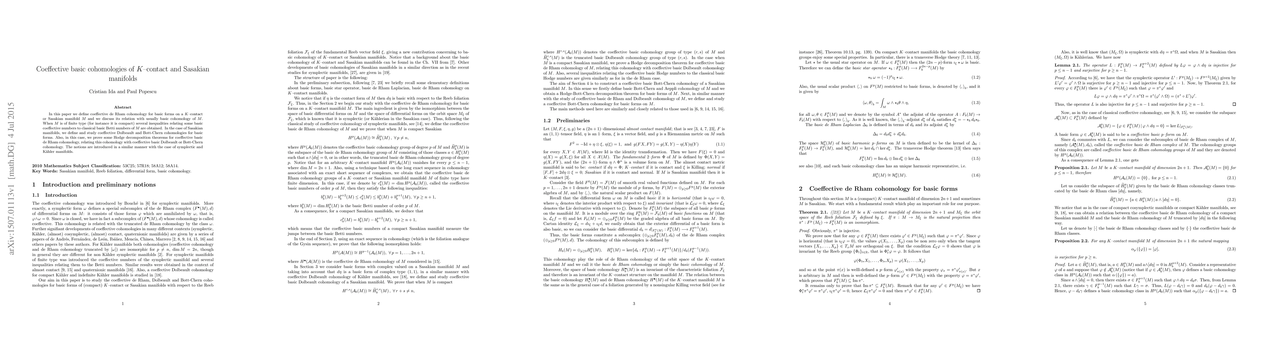 In this paper we define coeffective de Rham cohomology for basic forms on a $K$--contact or Sasakian manifold $M$ and we discuss its relation with usually basic cohomology of $M$. When $M$ is of finite type (for instance it is compact) several inequalities relating some basic coeffective numbers to classical basic Betti numbers of $M$ are obtained. In the case of Sasakian manifolds, we define and study coeffective Dolbeault and Bott-Chern cohomologies for basic forms. Also, in this case, we prove some Hodge decomposition theorems for coeffective basic de Rham cohomology, relating this cohomology with coeffective basic Dolbeault or Bott-Chern cohomology. The notions are introduced in a similar manner with the case of symplectic and K\"ahler manifolds.