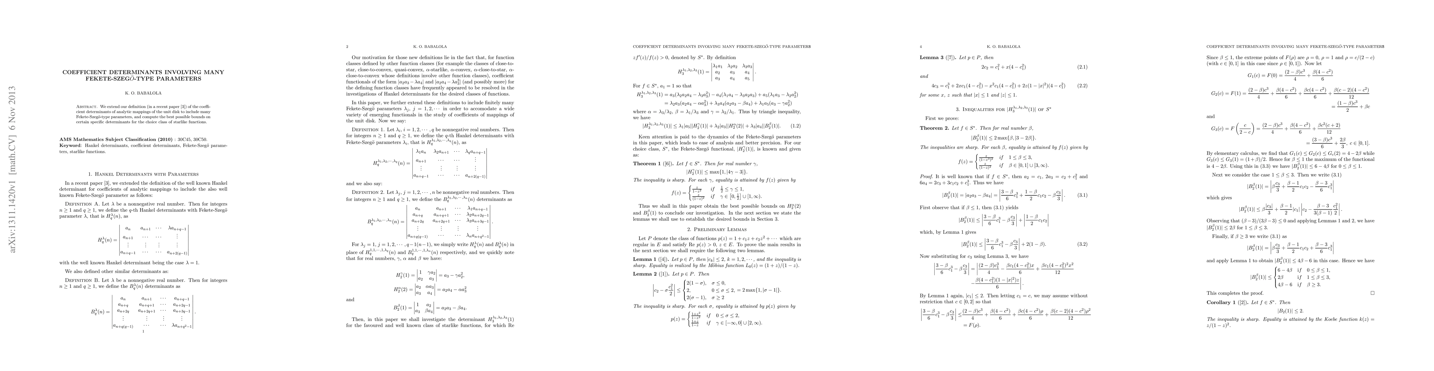 We extend our definition (in a recent paper \cite{KB}) of the coefficient determinants of analytic mappings of the unit disk to include many Fekete-Szeg$\ddot{o}$-type parameters, and compute the best possible bounds on certain specific determinants for the choice class of starlike functions.