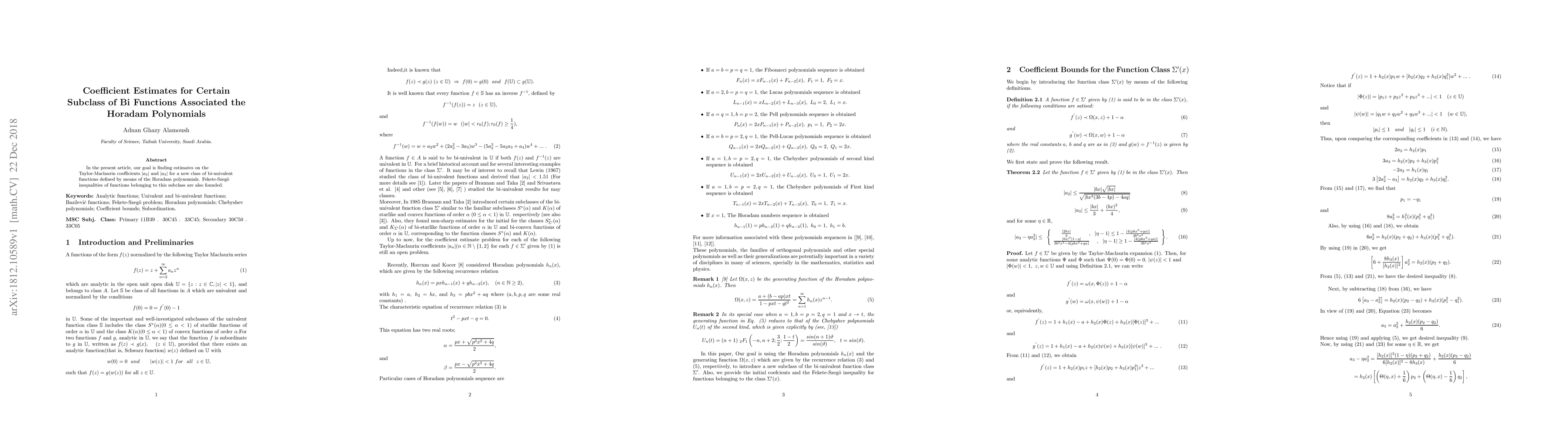 The paper estimates the Taylor-Maclaurin coefficients |a2| and |a3| for a subclass of bi-univalent functions linked to Horadam polynomials, and establishes Fekete-Szegő inequalities for these functions.