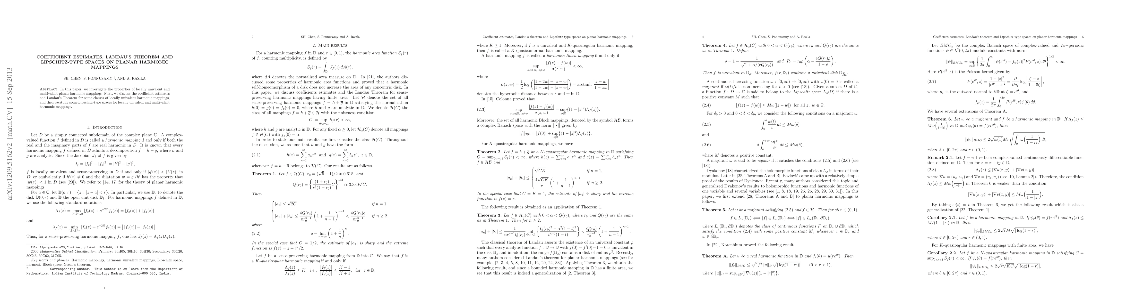 Summary: This paper examines coefficient estimates and Landau's Theorem for locally univalent harmonic mappings, and explores Lipschitz-type spaces for both locally univalent and multivalent planar harmonic mappings.