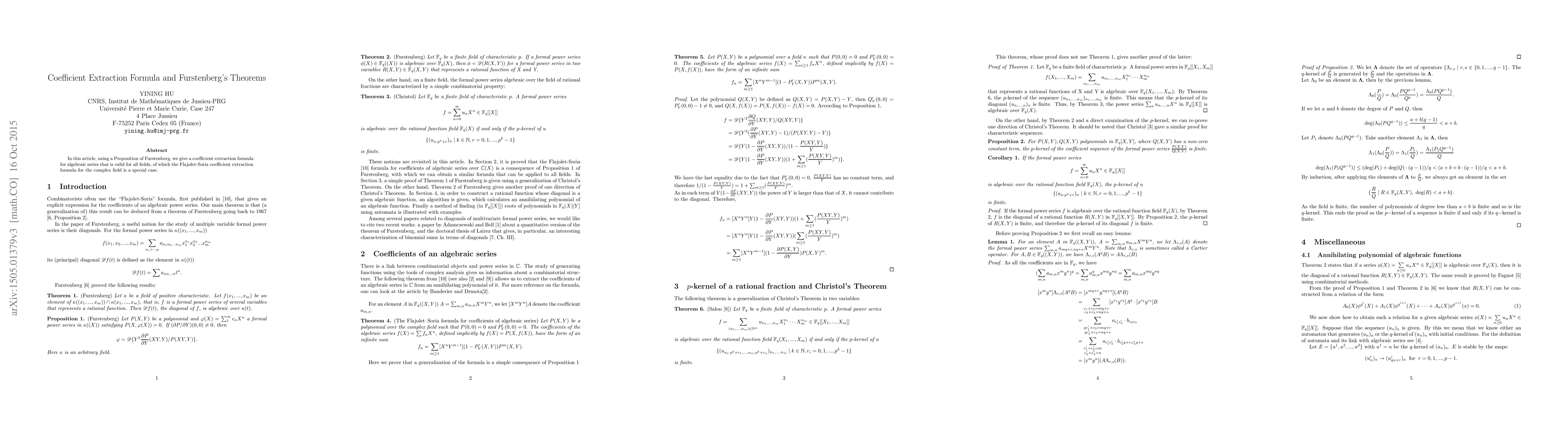 In this article, using a Proposition of Furstenberg, we give a coefficient extraction formula for algebraic series that is valid for all fields, of which the Flajolet-Soria coefficient extraction formula for the complex field is a special case.