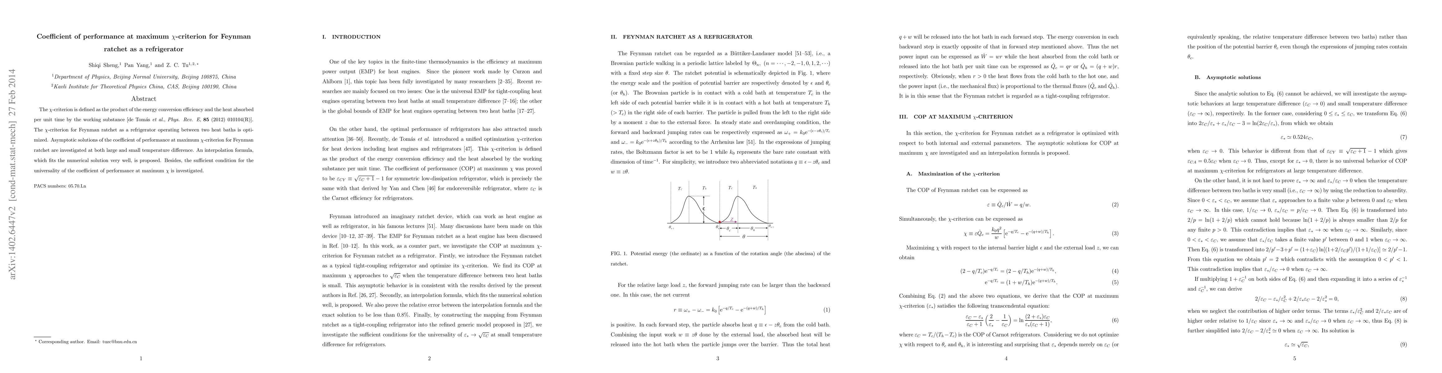 The \chi-criterion is defined as the product of the energy conversion efficiency and the heat absorbed per-unit-time by the working substance [de Tom\'as et al., Phys. Rev. E, 85 (2012) 010104(R)]. The \chi-criterion for Feynman ratchet as a refrigerator operating between two heat baths is optimized. Asymptotic solutions of the coefficient of performance at maximum \chi-criterion for Feynman ratchet are investigated at both large and small temperature difference. An interpolation formula, which fits the numerical solution very well, is proposed. Besides, the sufficient condition for the universality of the coefficient of performance at maximum \chi is investigated.