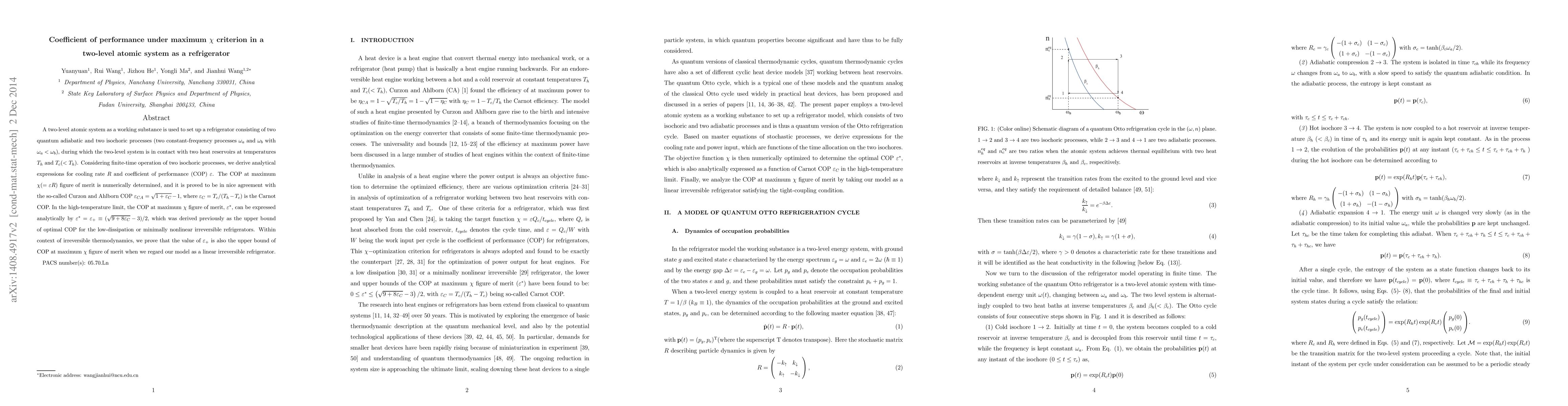 This paper investigates the coefficient of performance (COP) for a refrigerator using a two-level atomic system under a maximum $\chi$ criterion. Analytical expressions for cooling rate and COP are derived, showing agreement with the Curzon and Ahlborn COP, and the high-temperature limit COP is analytically expressed as $\varepsilon^* = \varepsilon_+ \equiv (\sqrt{9+8\varepsilon_C}-3)/2$, confirming it as the upper bound for optimal COP.