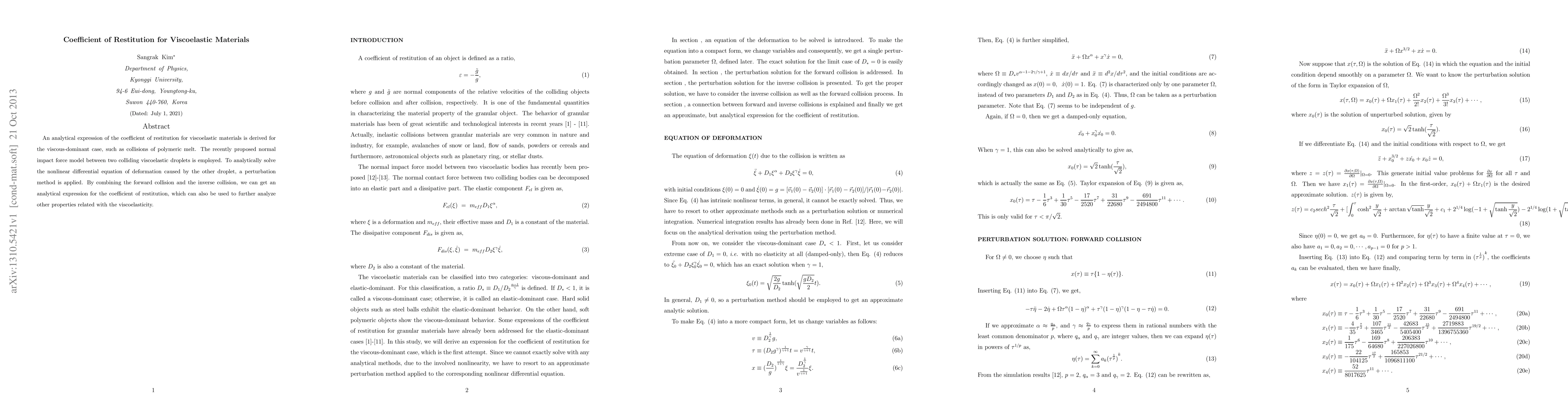 This paper derives an analytical expression for the coefficient of restitution in viscoelastic materials, focusing on the viscous-dominant case, using a perturbation method to solve the nonlinear differential equation of deformation. The model can be applied to analyze collisions in polymeric melts and related viscoelastic properties.