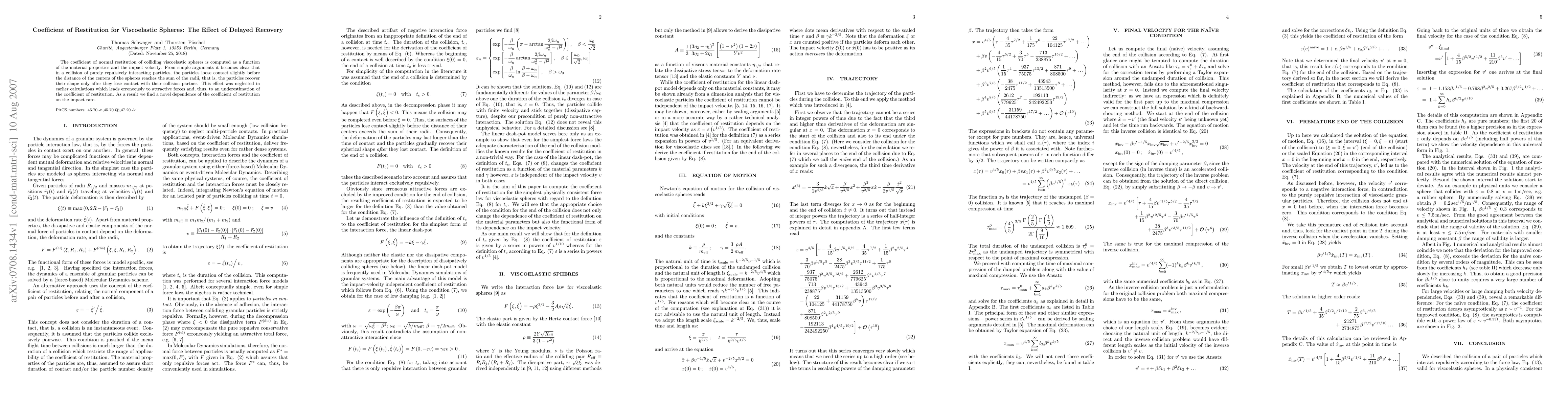 This study computes the coefficient of normal restitution for viscoelastic spheres, revealing that delayed recovery after collision affects the restitution coefficient. Prior calculations underestimated the coefficient due to neglecting the time lag in shape recovery, leading to a new dependency on impact velocity.