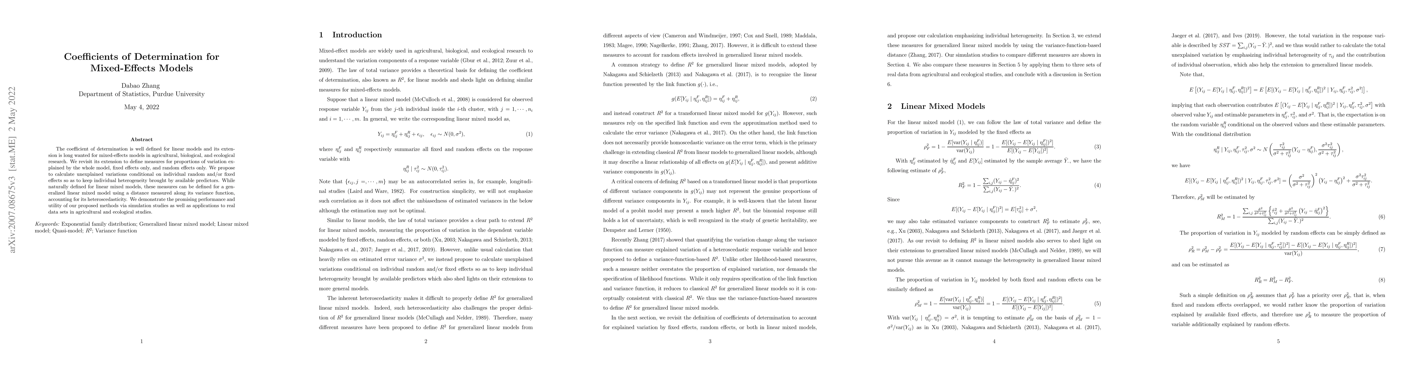 This paper proposes extensions of the coefficient of determination for mixed-effects models to quantify the proportion of variation explained by the whole model, fixed effects, and random effects. It introduces measures that account for individual heterogeneity and can be adapted for generalized linear mixed models, considering heteroscedasticity.