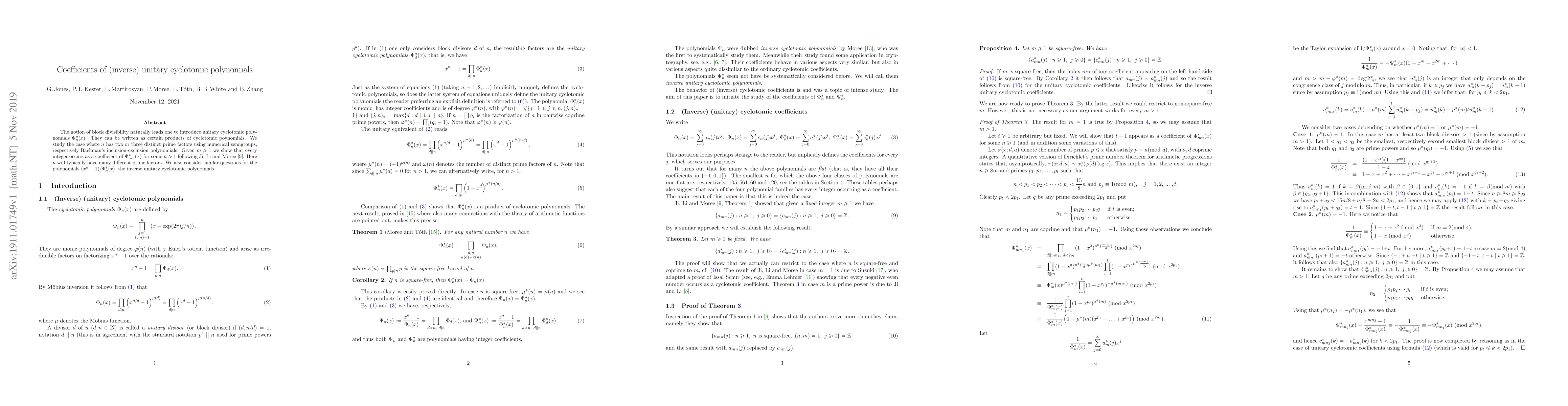 The technical contribution of this research is the development of new methods for analyzing the properties of cyclotomic polynomials, particularly in the context of unitary and inverse cyclotomic polynomials.