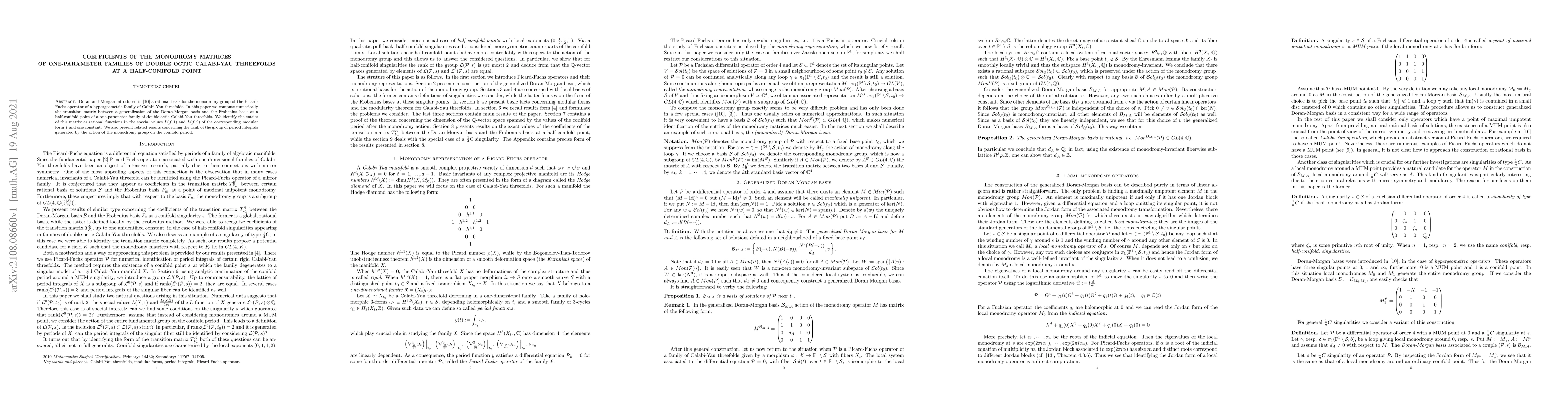 This paper computes the transition matrix between a Doran-Morgan basis and the Frobenius basis for the monodromy group of a one-parameter family of double octic Calabi-Yau threefolds at a half-conifold point, expressing its coefficients as rational functions in specific modular form values and a constant. It also discusses the rank of the group generated by the monodromy group's action on the conifold period.