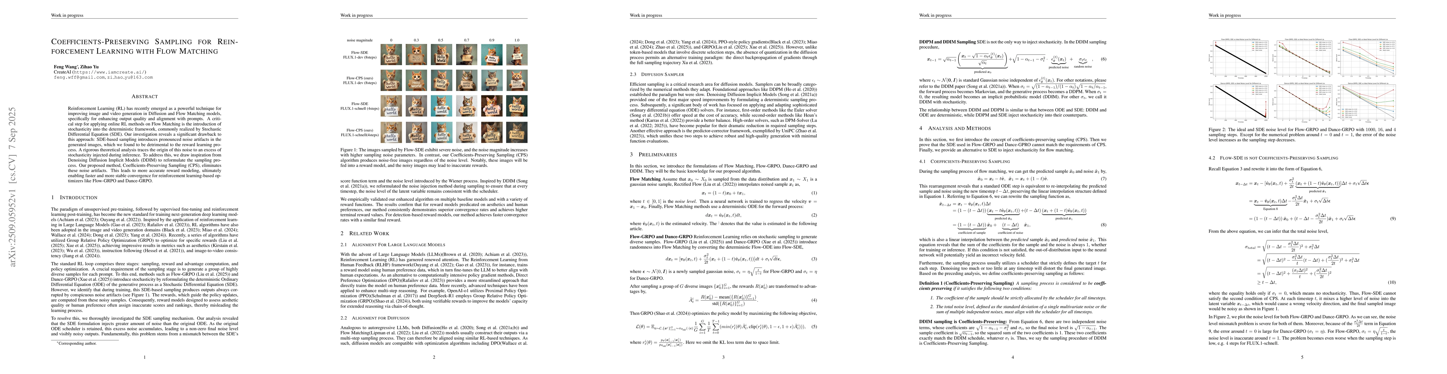 Reinforcement Learning (RL) has recently emerged as a powerful technique for improving image and video generation in Diffusion and Flow Matching models, specifically for enhancing output quality and alignment with prompts. A critical step for applying online RL methods on Flow Matching is the introduction of stochasticity into the deterministic framework, commonly realized by Stochastic Differential Equation (SDE). Our investigation reveals a significant drawback to this approach: SDE-based sampling introduces pronounced noise artifacts in the generated images, which we found to be detrimental to the reward learning process. A rigorous theoretical analysis traces the origin of this noise to an excess of stochasticity injected during inference. To address this, we draw inspiration from Denoising Diffusion Implicit Models (DDIM) to reformulate the sampling process. Our proposed method, Coefficients-Preserving Sampling (CPS), eliminates these noise artifacts. This leads to more accurate reward modeling, ultimately enabling faster and more stable convergence for reinforcement learning-based optimizers like Flow-GRPO and Dance-GRPO. Code will be released at https://github.com/IamCreateAI/FlowCPS