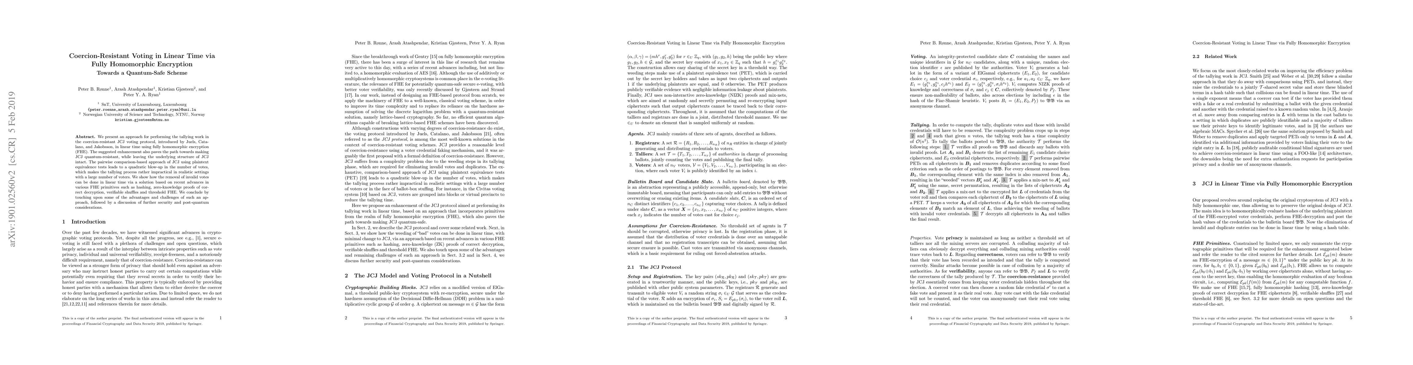 We present an approach for performing the tallying work in the coercion-resistant JCJ voting protocol, introduced by Juels, Catalano, and Jakobsson, in linear time using fully homomorphic encryption (FHE). The suggested enhancement also paves the path towards making JCJ quantum-resistant, while leaving the underlying structure of JCJ intact. The exhaustive, comparison-based approach of JCJ using plaintext equivalence tests leads to a quadratic blow-up in the number of votes, which makes the tallying process rather impractical in realistic settings with a large number of voters. We show how the removal of invalid votes can be done in linear time via a solution based on recent advances in various FHE primitives such as hashing, zero-knowledge proofs of correct decryption, verifiable shuffles and threshold FHE. We conclude by touching upon some of the advantages and challenges of such an approach, followed by a discussion of further security and post-quantum considerations.