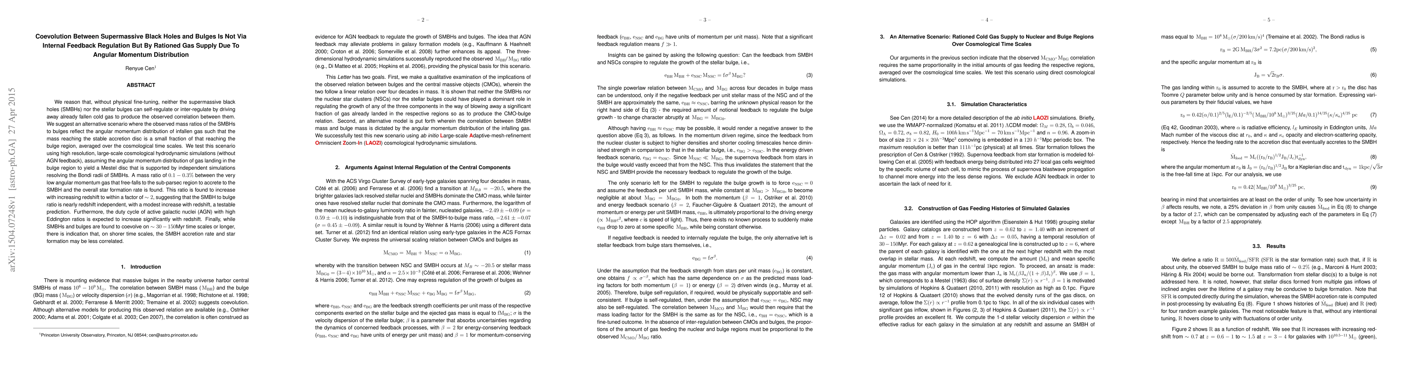 We reason that, without physical fine-tuning, neither the supermassive black holes (SMBHs) nor the stellar bulges can self-regulate or inter-regulate by driving away already fallen cold gas to produce the observed correlation between them. We suggest an alternative scenario where the observed mass ratios of the SMBHs to bulges reflect the angular momentum distribution of infallen gas such that the mass reaching the stable accretion disc is a small fraction of that reaching the bulge region, averaged over the cosmological time scales. We test this scenario using high resolution, large-scale cosmological hydrodynamic simulations (without AGN feedback), assuming the angular momentum distribution of gas landing in the bulge region to yield a Mestel disc that is supported by independent simulations resolving the Bondi radii of SMBHs. A mass ratio of $0.1-0.3\%$ between the very low angular momentum gas that free-falls to the sub-parsec region to accrete to the SMBH and the overall star formation rate is found. This ratio is found to increase with increasing redshift to within a factor of $\sim 2$, suggesting that the SMBH to bulge ratio is nearly redshift independent, with a modest increase with redshift, a testable prediction. Furthermore, the duty cycle of active galactic nuclei (AGN) with high Eddington ratios is expected to increase significantly with redshift. Finally, while SMBHs and bulges are found to coevolve on $\sim 30-150$Myr time scales or longer, there is indication that, on shorer time scales, the SMBH accretion rate and star formation may be less correlated.