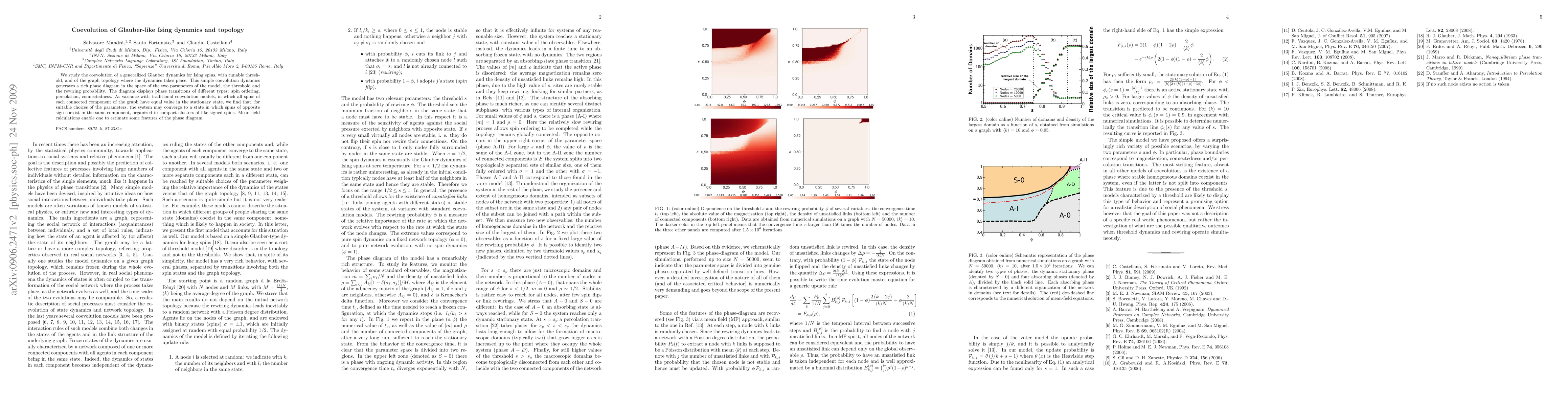 We study the coevolution of a generalized Glauber dynamics for Ising spins, with tunable threshold, and of the graph topology where the dynamics takes place. This simple coevolution dynamics generates a rich phase diagram in the space of the two parameters of the model, the threshold and the rewiring probability. The diagram displays phase transitions of different types: spin ordering, percolation, connectedness. At variance with traditional coevolution models, in which all spins of each connected component of the graph have equal value in the stationary state, we find that, for suitable choices of the parameters, the system may converge to a state in which spins of opposite sign coexist in the same component, organized in compact clusters of like-signed spins. Mean field calculations enable one to estimate some features of the phase diagram.