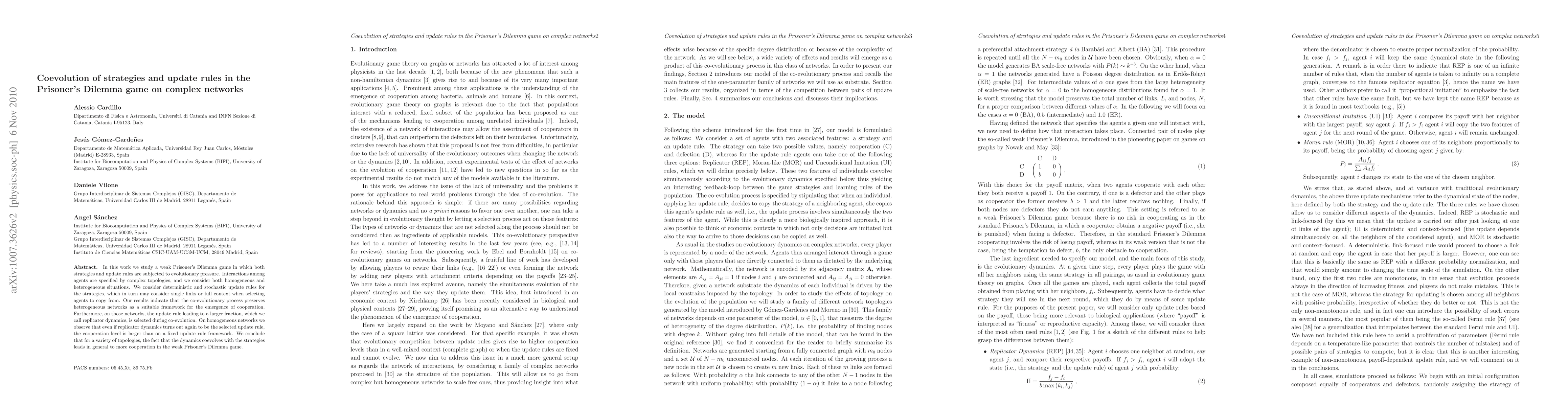 In this work we study a weak Prisoner\^as Dilemma game in which both strategies and update rules are subjected to evolutionary pressure. Interactions among agents are specified by complex topologies, and we consider both homogeneous and heterogeneous situations. We consider deterministic and stochastic update rules for the strategies, which in turn may consider single links or full context when selecting agents to copy from. Our results indicate that the co-evolutionary process preserves heterogeneous networks as a suitable framework for the emergence of cooperation. Furthermore, on those networks, the update rule leading to a larger fraction, which we call replicator dynamics, is selected during co-evolution. On homogeneous networks we observe that even if replicator dynamics turns out again to be the selected update rule, the cooperation level is larger than on a fixed update rule framework. We conclude that for a variety of topologies, the fact that the dynamics coevolves with the strategies leads in general to more cooperation in the weak Prisoner's Dilemma game.