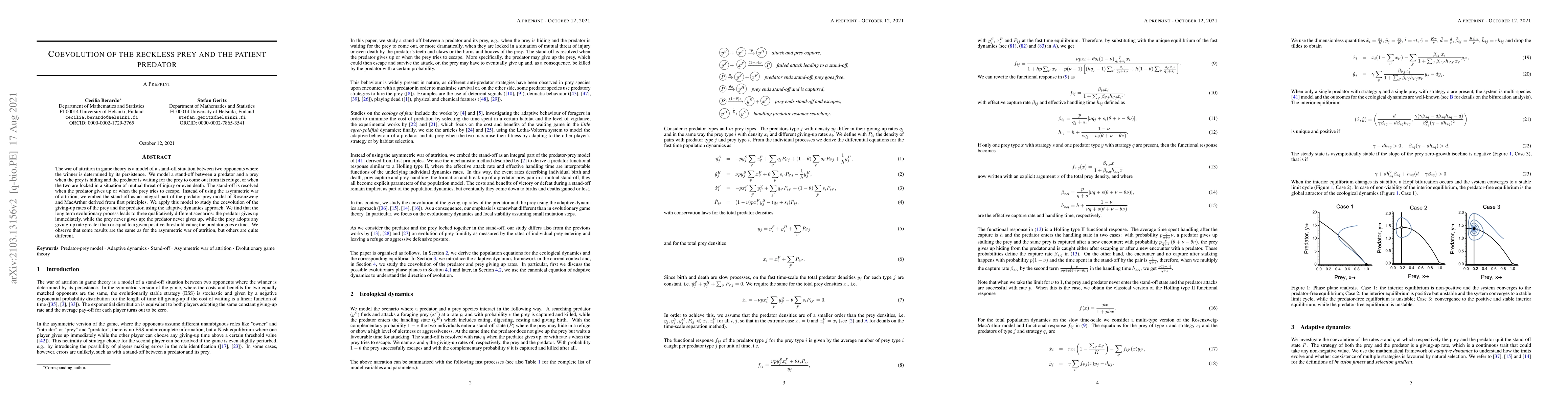 This research explores the coevolution of a reckless prey and a patient predator through a game-theoretic war of attrition model embedded in a Rosenzweig-MacArthur predator-prey framework. The study finds three distinct evolutionary outcomes: the predator gives up immediately, the prey adopts a minimum giving-up threshold, or the predator goes extinct. Some results align with the asymmetric war of attrition, while others differ significantly.