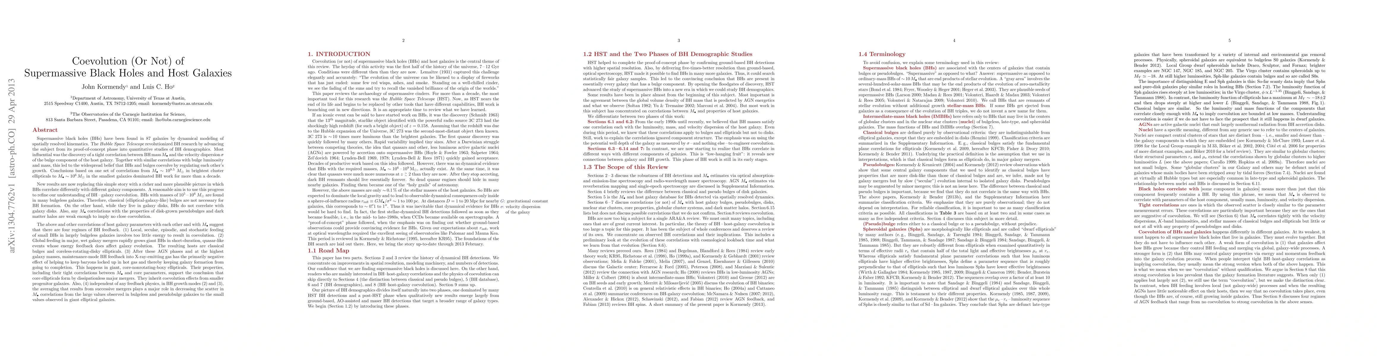 We review the observed demographics and inferred evolution of supermassive black holes (BHs) found by dynamical modeling of spatially resolved kinematics. Most influential was the discovery of a tight correlation between BH mass and the velocity dispersion of the host-galaxy bulge. It and other correlations led to the belief that BHs and bulges coevolve by regulating each other's growth. New results are now replacing this simple story with a richer and more plausible picture in which BHs correlate differently with different galaxy components. BHs are found in pure-disk galaxies, so classical (elliptical-galaxy-like) bulges are not necessary to grow BHs. But BHs do not correlate with galaxy disks. And any correlations with disk-grown pseudobulges or halo dark matter are so weak as to imply no close coevolution. We suggest that there are four regimes of BH feedback. 1- Local, stochastic feeding of small BHs in mainly bulgeless galaxies involves too little energy to result in coevolution. 2- Global feeding in major, wet galaxy mergers grows giant BHs in short, quasar-like "AGN" events whose feedback does affect galaxies. This makes classical bulges and coreless-rotating ellipticals. 3- At the highest BH masses, maintenance-mode feedback into X-ray gas has the negative effect of helping to keep baryons locked up in hot gas. This happens in giant, core-nonrotating ellipticals. They inherit coevolution magic from smaller progenitors. 4- Independent of any feedback physics, the averaging that results from successive mergers helps to engineer tight BH correlations.