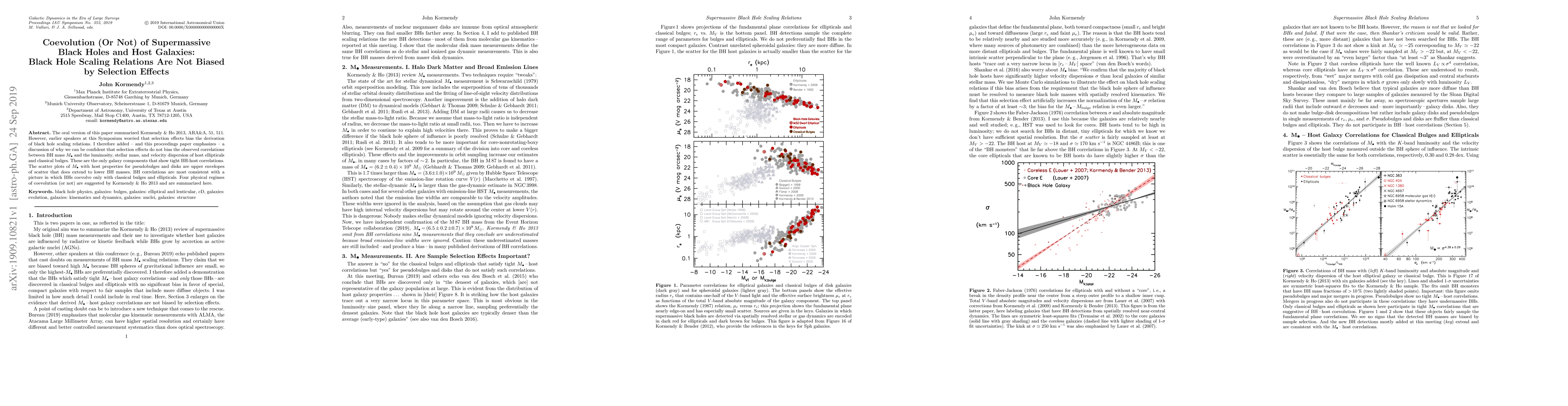 The oral version of this paper summarized Kormendy & Ho 2013, ARA&A, 51, 511. However, earlier speakers at this Symposium worried that selection effects bias the derivation of black hole scaling relations. I therefore added -- and this proceedings paper emphasizes -- a discussion of why we can be confident that selection effects do not bias the observed correlations between BH mass M_BH and the luminosity, stellar mass, and velocity dispersion of host ellipticals and classical bulges. These are the only galaxy components that show tight BH-host correlations. The scatter plots of M_BH with host properties for pseudobulges and disks are upper envelopes of scatter that does extend to lower BH masses. BH correlations are most consistent with a picture in which BHs coevolve only with classical bulges and ellipticals. Four physical regimes of coevolution (or not) are suggested by Kormendy & Ho 2013 and are summarized here.