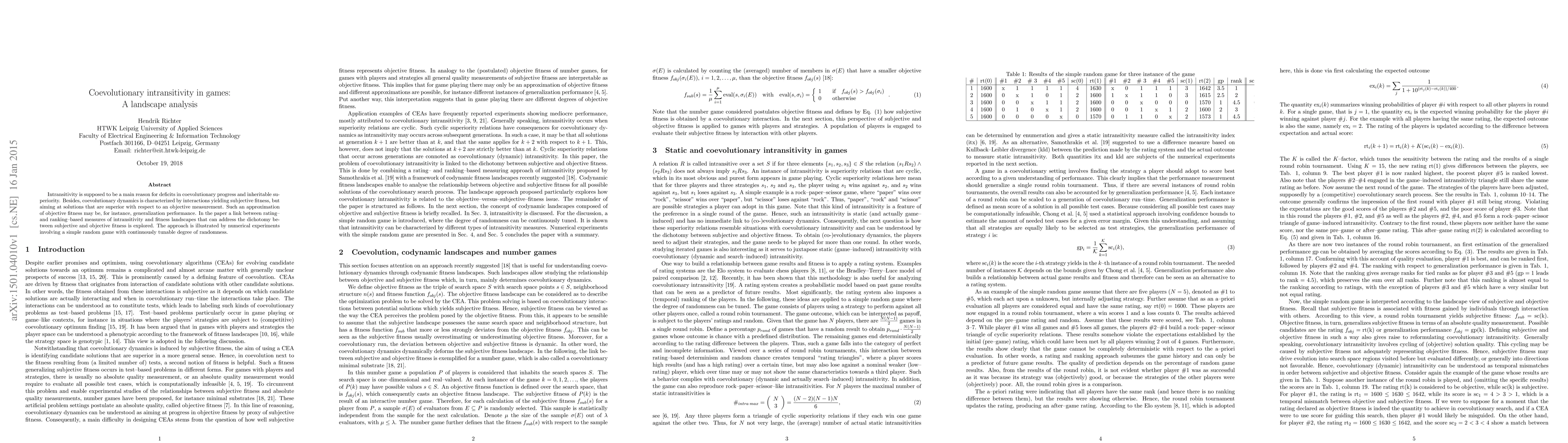 The research methodology involves a landscape analysis linking rating- and ranking-based measures of intransitivity with fitness landscapes to explore the dichotomy between subjective and objective fitness. This is illustrated through numerical experiments with a simple random game featuring a continuously tunable degree of randomness.