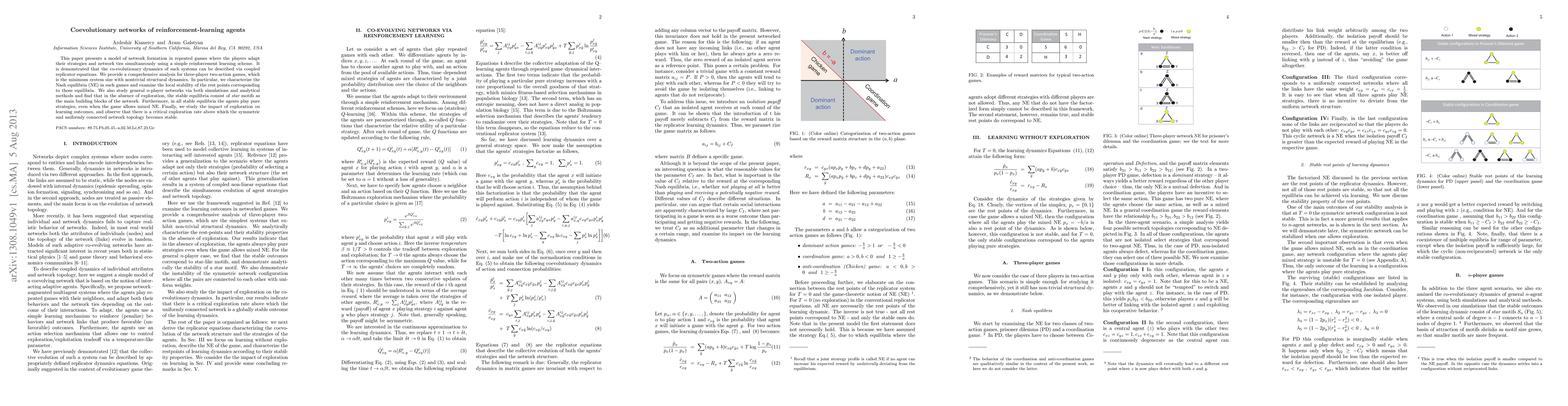 This paper presents a model of network formation in repeated games where the players adapt their strategies and network ties simultaneously using a simple reinforcement-learning scheme. It is demonstrated that the coevolutionary dynamics of such systems can be described via coupled replicator equations. We provide a comprehensive analysis for three-player two-action games, which is the minimum system size with nontrivial structural dynamics. In particular, we characterize the Nash equilibria (NE) in such games and examine the local stability of the rest points corresponding to those equilibria. We also study general n-player networks via both simulations and analytical methods and find that in the absence of exploration, the stable equilibria consist of star motifs as the main building blocks of the network. Furthermore, in all stable equilibria the agents play pure strategies, even when the game allows mixed NE. Finally, we study the impact of exploration on learning outcomes, and observe that there is a critical exploration rate above which the symmetric and uniformly connected network topology becomes stable.