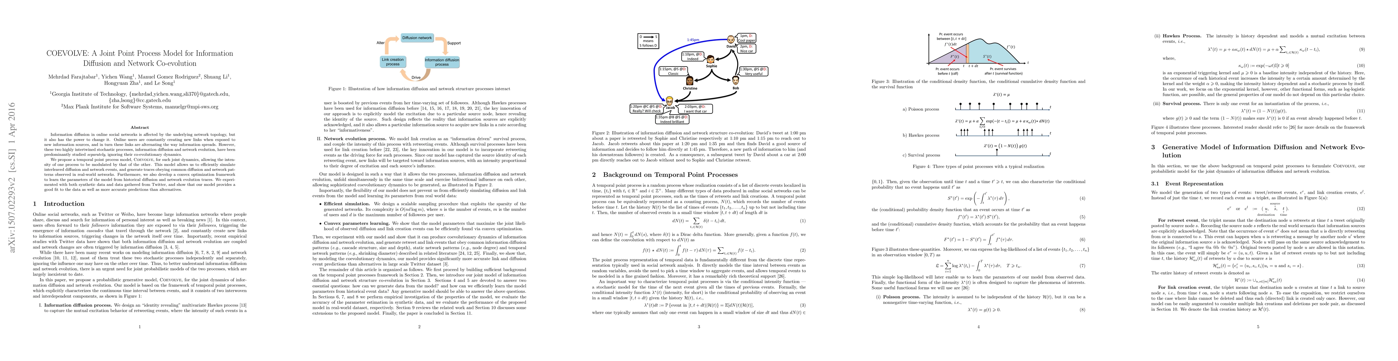 Information diffusion in online social networks is affected by the underlying network topology, but it also has the power to change it. Online users are constantly creating new links when exposed to new information sources, and in turn these links are alternating the way information spreads. However, these two highly intertwined stochastic processes, information diffusion and network evolution, have been predominantly studied separately, ignoring their co-evolutionary dynamics. We propose a temporal point process model, COEVOLVE, for such joint dynamics, allowing the intensity of one process to be modulated by that of the other. This model allows us to efficiently simulate interleaved diffusion and network events, and generate traces obeying common diffusion and network patterns observed in real-world networks. Furthermore, we also develop a convex optimization framework to learn the parameters of the model from historical diffusion and network evolution traces. We experimented with both synthetic data and data gathered from Twitter, and show that our model provides a good fit to the data as well as more accurate predictions than alternatives.
