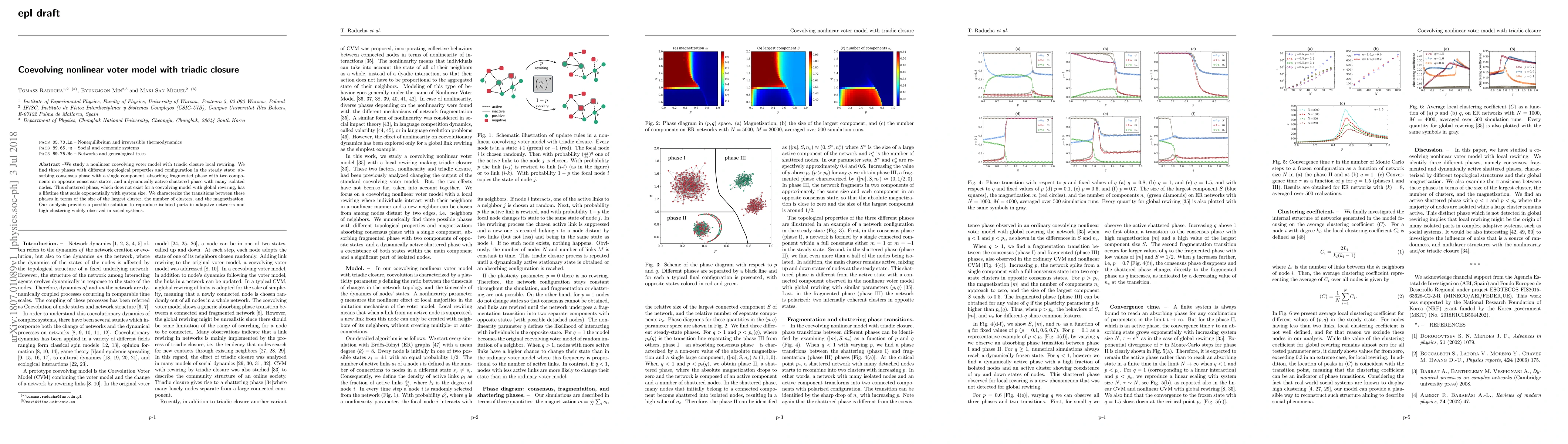 We study a nonlinear coevolving voter model with triadic closure local rewiring. We find three phases with different topological properties and configuration in the steady state: absorbing consensus phase with a single component, absorbing fragmented phase with two components in opposite consensus states, and a dynamically active shattered phase with many isolated nodes. This shattered phase, which does not exist for a coevolving model with global rewiring, has a lifetime that scale exponentially with system size. We characterize the transitions between these phases in terms of the size of the largest cluster, the number of clusters, and the magnetization. Our analysis provides a possible solution to reproduce isolated parts in adaptive networks and high clustering widely observed in social systems.