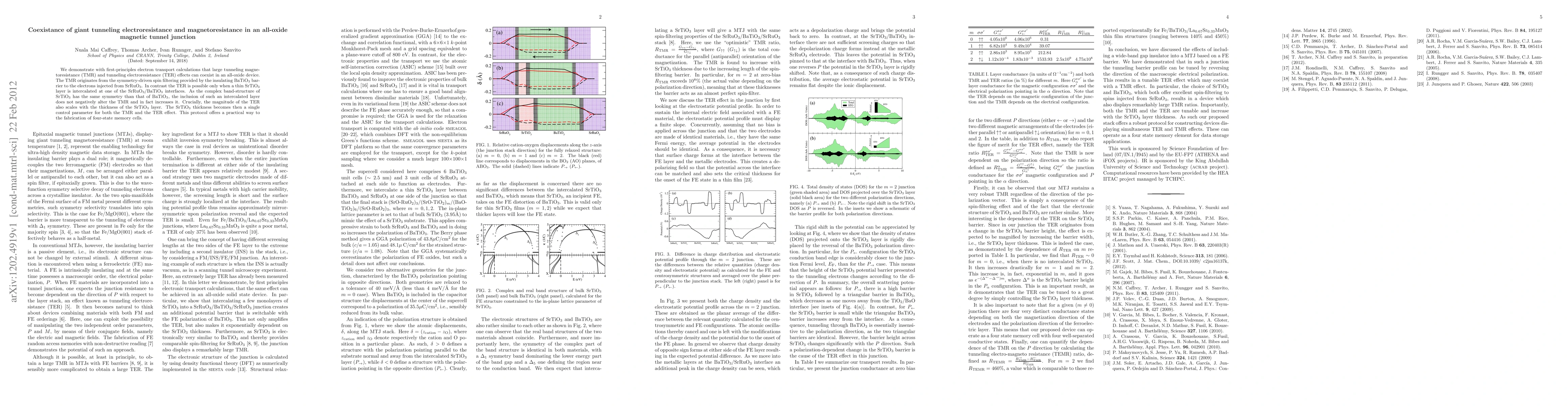 This paper demonstrates that both giant tunneling electroresistance (TER) and tunneling magnetoresistance (TMR) can coexist in an all-oxide magnetic tunnel junction, with TMR originating from spin filtering by the BaTiO3 barrier and TER enabled by a thin SrTiO3 layer at the interface, enhancing both effects. The SrTiO3 thickness serves as a control parameter for both resistance effects, paving the way for four-state memory cells.