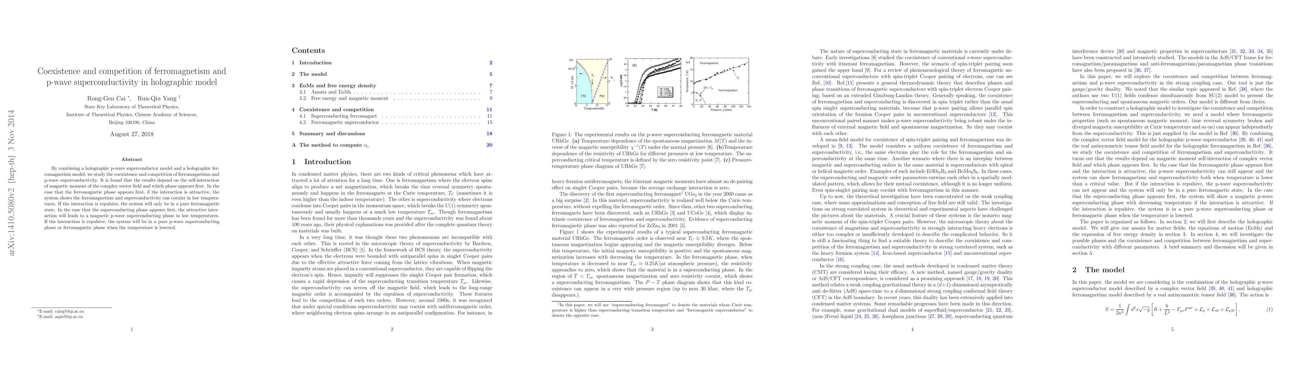 This paper explores the interplay between ferromagnetism and p-wave superconductivity in a holographic model, finding that the outcome hinges on the magnetic moment's self-interaction and the initial phase transition. Attractive interactions favor coexistence of both phases, while repulsive interactions lead to pure ferromagnetic or p-wave superconducting states.