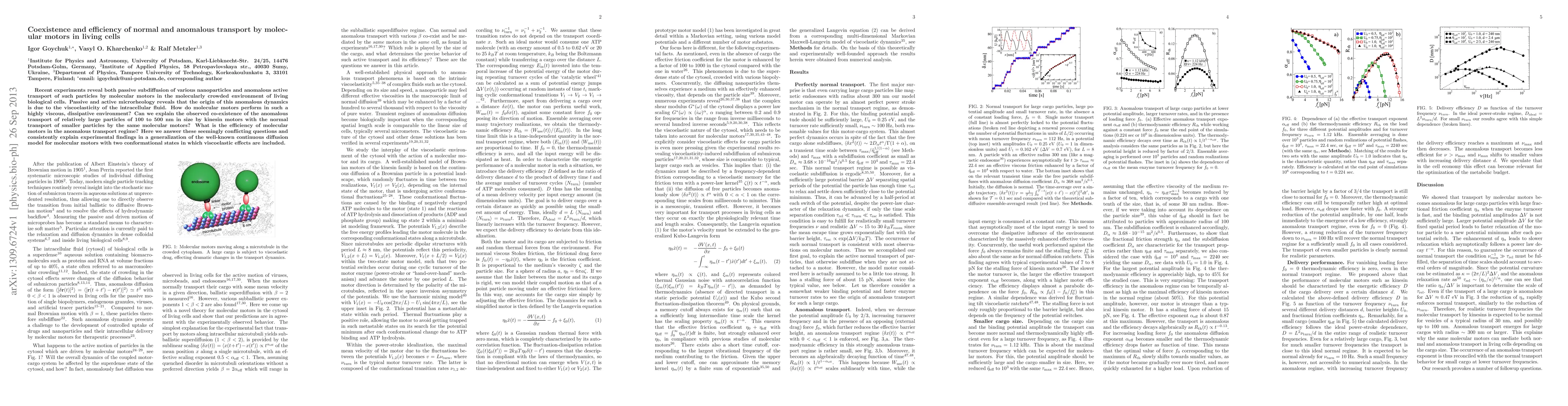 This paper investigates the coexistence and efficiency of normal and anomalous transport by molecular motors in living cells, revealing that both passive subdiffusion and active transport by motors are influenced by the viscoelastic properties of the intracellular fluid. The study provides a generalized diffusion model to explain the observed transport dynamics, addressing the efficiency of motors in anomalous conditions.