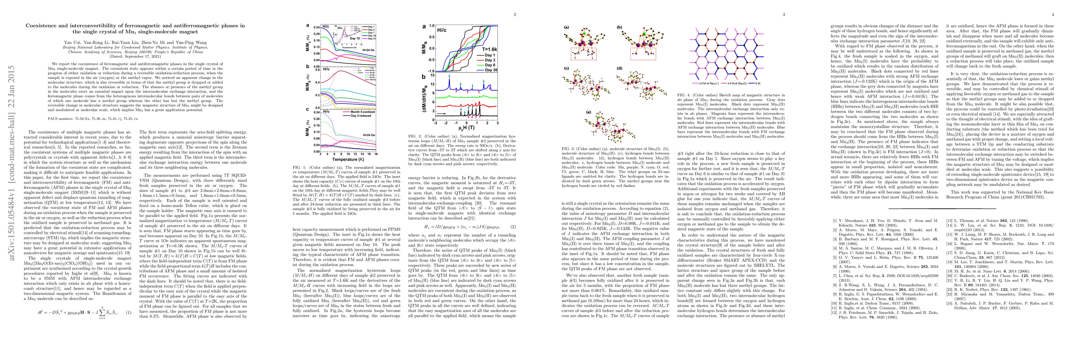 We report the coexistence of ferromagnetic and antiferromagnetic phases in the single crystal of Mn$_3$ single-molecule magnet. The coexistent state appears within a certain period of time in the progress of either oxidation or reduction during a reversible oxidation-reduction process, when the sample is exposed in the air (oxygen) or the methyl vapor. We noticed an apparent change in the molecular structure, which is also reversible in terms of that the methyl group is dropped or added to the molecules during the oxidation or reduction. The absence or presence of the methyl group in the molecules exert an essential impact upon the intermolecular exchange interaction, and the ferromagnetic phase comes from the heterogenous intermolecular bonds between pairs of molecules of which one molecule has a methyl group whereas the other has lost the methyl group. The reversible change in molecular structure suggests the magnetic structure of Mn$_3$ might be designed and modulated at molecular scale, which implies Mn$_3$ has a great application potential.