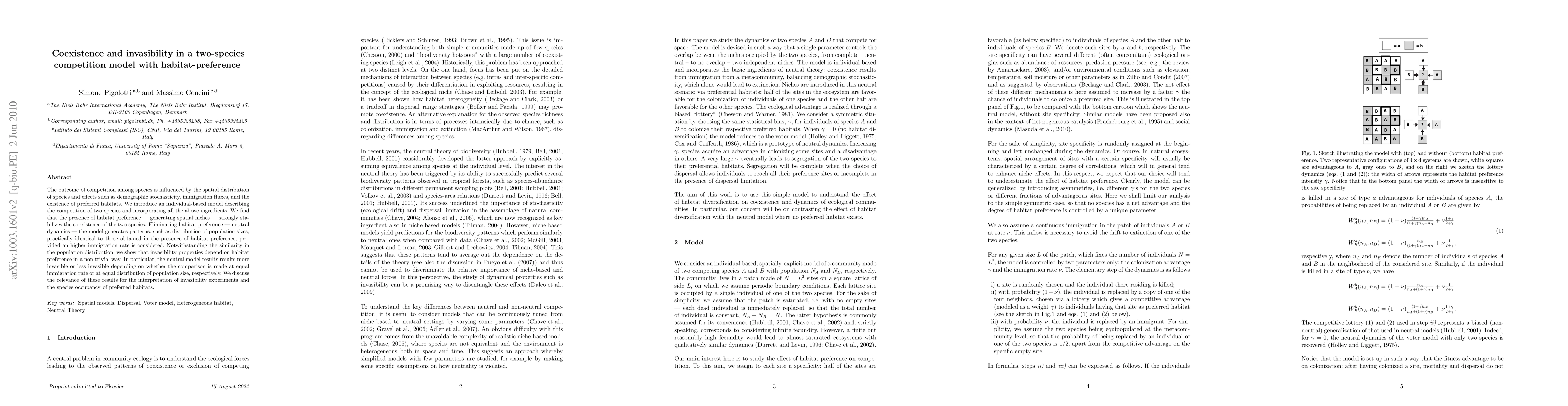 This paper explores a two-species competition model with habitat preference, finding that spatial niches stabilize coexistence. It reveals that neutral dynamics, without habitat preference, can mimic population distributions but lead to different invasibility properties based on immigration rates and population size distribution.