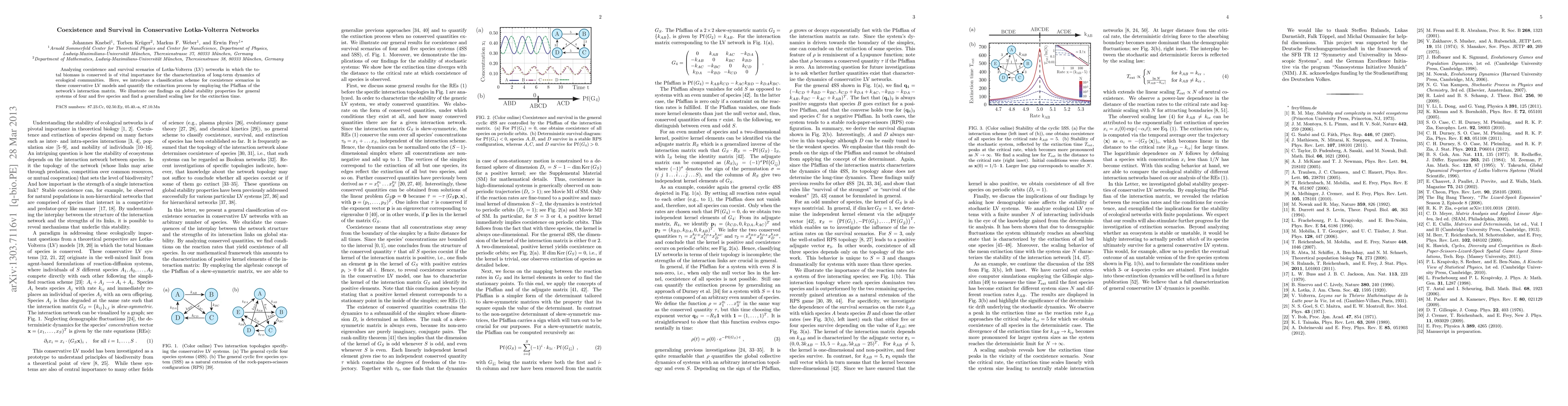 Analyzing coexistence and survival scenarios of Lotka-Volterra (LV) networks in which the total biomass is conserved is of vital importance for the characterization of long-term dynamics of ecological communities. Here, we introduce a classification scheme for coexistence scenarios in these conservative LV models and quantify the extinction process by employing the Pfaffian of the network's interaction matrix. We illustrate our findings on global stability properties for general systems of four and five species and find a generalized scaling law for the extinction time.