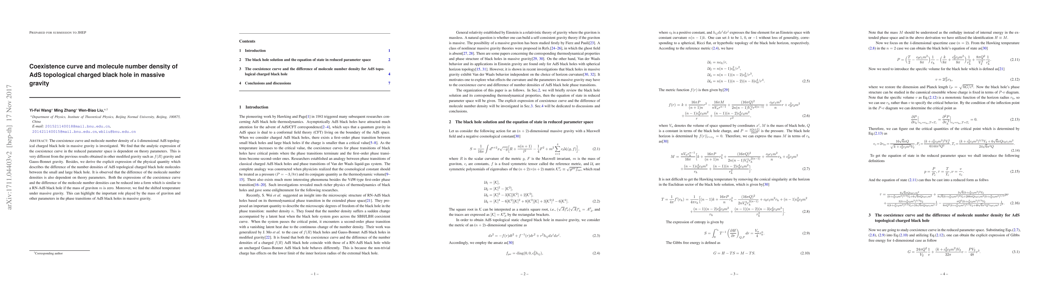 The coexistence curve and molecule number density of a 4-dimensional AdS topological charged black hole in massive gravity is investigated. We find that the analytic expression of the coexistence curve in the reduced parameter space is dependent on theory parameters. This is very different from the previous results obtained in other modified gravity such as $f(R)$ gravity and Gauss-Bonnet gravity. Besides, we derive the explicit expression of the physical quantity which describes the difference of the number densities of AdS topological charged black hole molecules between the small and large black hole. It is observed that the difference of the molecule number densities is also dependent on theory parameters. Both the expressions of the coexistence curve and the difference of the molecule number densities can be reduced into a form which is similar to a RN-AdS black hole if the mass of graviton $m$ is zero. Moreover, we find the shifted temperature under massive gravity. This can highlight the important role played by the mass of graviton and other parameters in the phase transitions of AdS black holes in massive gravity.