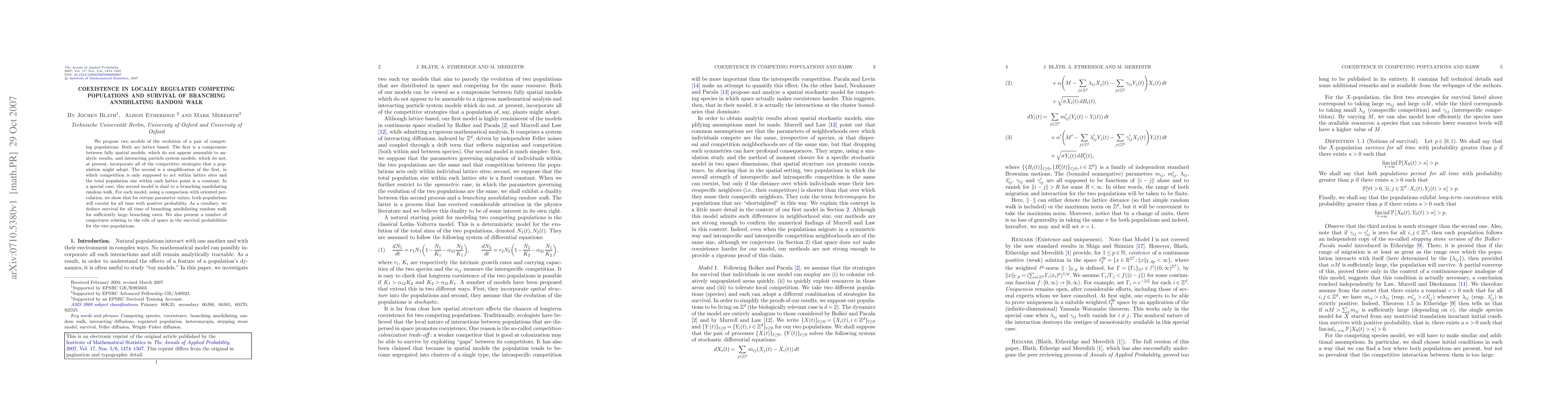 This paper proposes two lattice-based models for competing populations, showing coexistence for certain parameters and deducing the survival of a branching annihilating random walk under large branching rates. It also presents conjectures on the influence of spatial factors on survival probabilities.