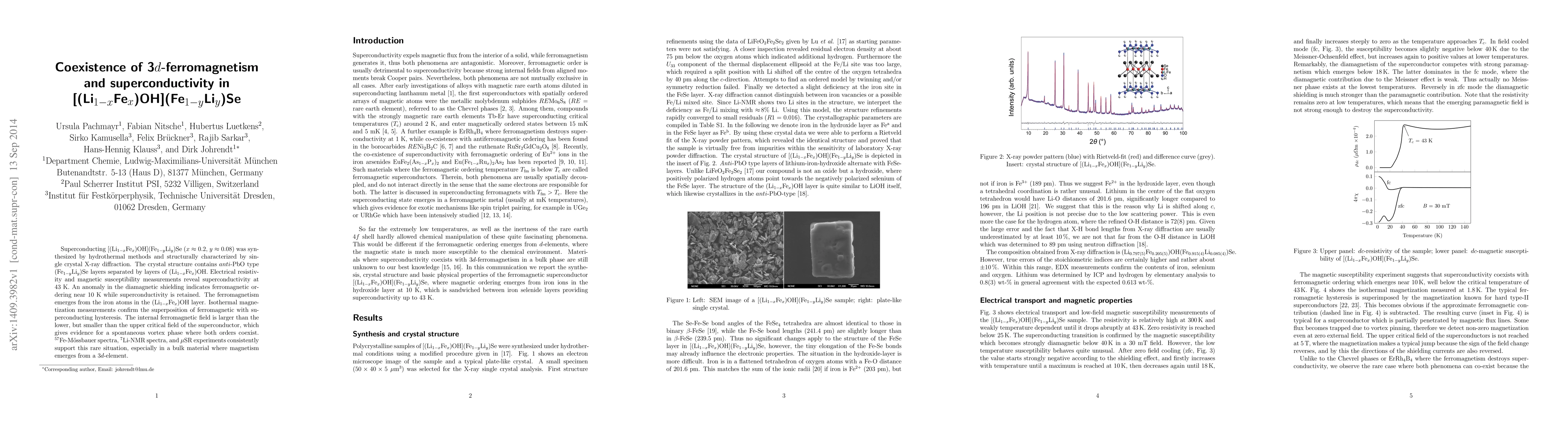 This paper reports the synthesis and characterization of a superconducting material, [(Li(1-x)Fex)OH](Fe(1-y)Liy)Se, which exhibits both 3d-ferromagnetism and superconductivity. The coexistence of these phenomena is evidenced by resistivity, susceptibility, and magnetization measurements, along with advanced spectroscopic techniques.