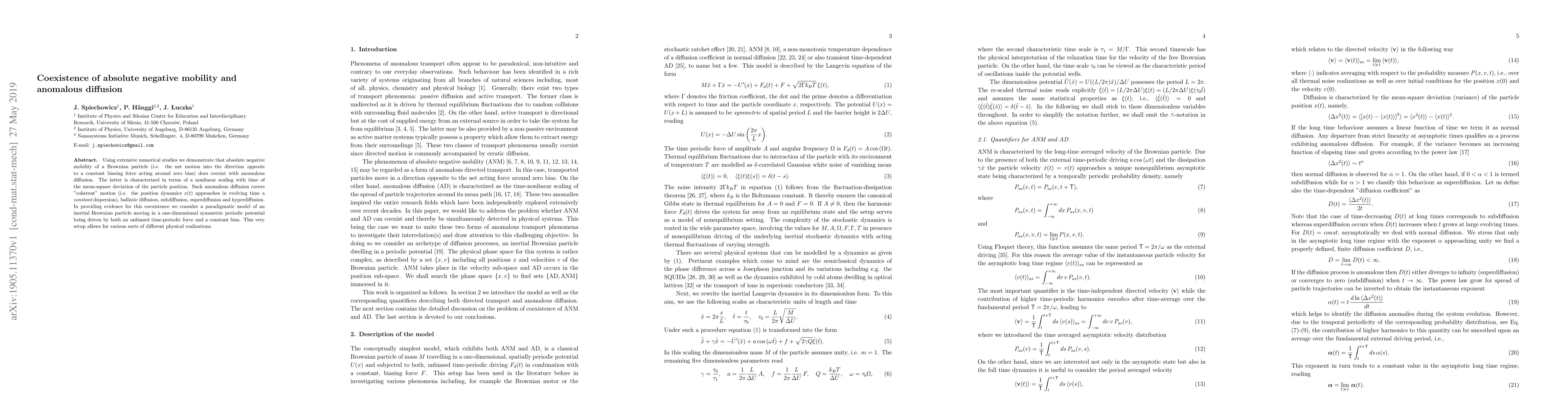 Using extensive numerical studies we demonstrate that absolute negative mobility of a Brownian particle (i.e. the net motion into the direction opposite to a constant biasing force acting around zero bias) does coexist with anomalous diffusion. The latter is characterized in terms of a nonlinear scaling with time of the mean-square deviation of the particle position. Such anomalous diffusion covers "coherent" motion (i.e. the position dynamics x(t) approaches in evolving time a constant dispersion), ballistic diffusion, subdiffusion, superdiffusion and hyperdiffusion. In providing evidence for this coexistence we consider a paradigmatic model of an inertial Brownian particle moving in a one-dimensional symmetric periodic potential being driven by both an unbiased time-periodic force and a constant bias. This very setup allows for various sorts of different physical realizations.