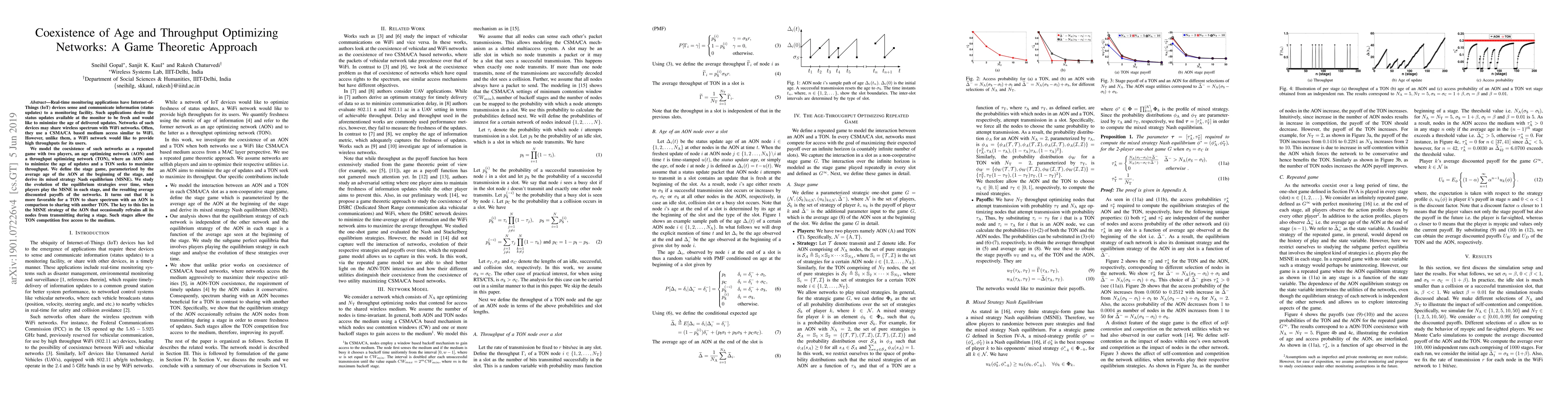 Real-time monitoring applications have Internet-of-Things (IoT) devices sense and communicate information (status updates) to a monitoring facility. Such applications desire the status updates available at the monitor to be fresh and would like to minimize the age of delivered updates. Networks of such devices may share wireless spectrum with WiFi networks. Often, they use a CSMA/CA based medium access similar to WiFi. However, unlike them, a WiFi network would like to provide high throughputs for its users. We model the coexistence of such networks as a repeated game with two players, an age optimizing network (AON) and a throughput optimizing network (TON), where an AON aims to minimize the age of updates and a TON seeks to maximize throughput. We define the stage game, parameterized by the average age of the AON at the beginning of the stage, and derive its mixed strategy Nash equilibrium (MSNE). We study the evolution of the equilibrium strategies over time, when players play the MSNE in each stage, and the resulting average discounted payoffs of the networks. It turns out that it is more favorable for a TON to share spectrum with an AON in comparison to sharing with another TON. The key to this lies in the MSNE strategy of the AON that occasionally refrains all its nodes from transmitting during a stage. Such stages allow the TON competition free access to the medium.