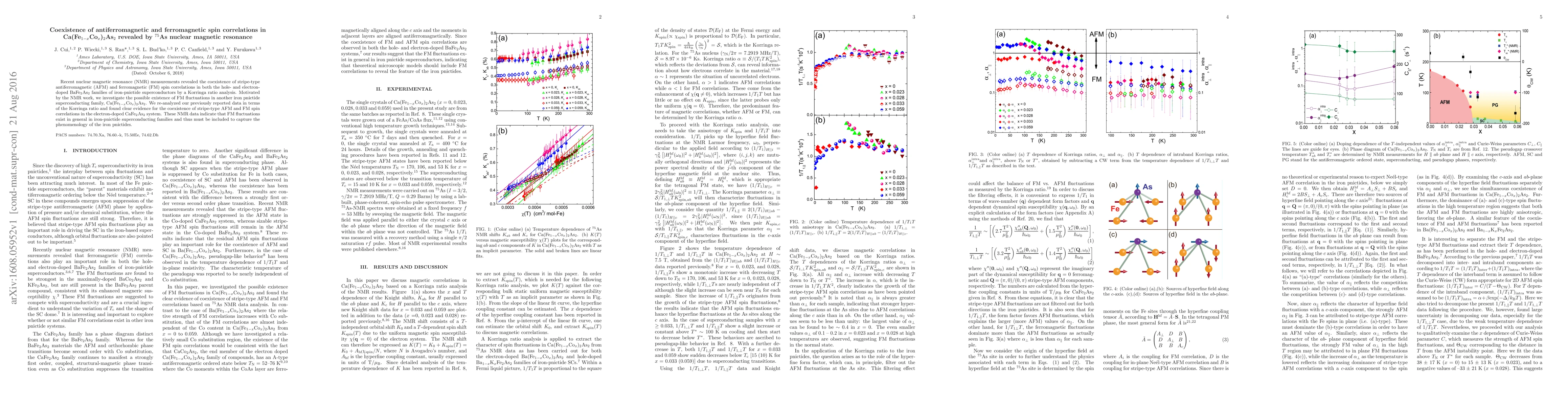 Recent nuclear magnetic resonance (NMR) measurements revealed the coexistence of stripe-type antiferromagnetic (AFM) and ferromagnetic (FM) spin correlations in both the hole- and electron-doped BaFe$_2$As$_2$ families of iron-pnictide superconductors by a Korringa ratio analysis. Motivated by the NMR work, we investigate the possible existence of FM fluctuations in another iron pnictide superconducting family, Ca(Fe$_{1-x}$Co$_x$)$_2$As$_2$. We re-analyzed our previously reported data in terms of the Korringa ratio and found clear evidence for the coexistence of stripe-type AFM and FM spin correlations in the electron-doped CaFe$_2$As$_2$ system. These NMR data indicate that FM fluctuations exist in general in iron-pnictide superconducting families and thus must be included to capture the phenomenology of the iron pnictides.