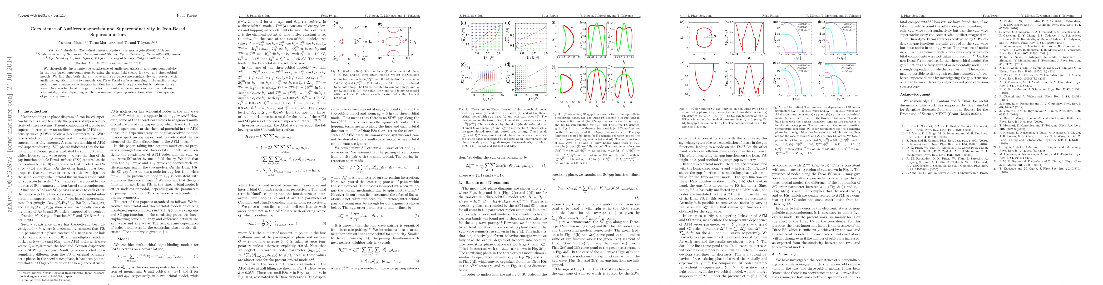 We theoretically investigate the coexistence of antiferromagnetism and superconductivity in the iron-based superconductors by using the mean-field theory for two- and three-orbital models. We find that both the s_{+-}-wave and s_{++}-wave superconductivity can coexist with antiferromagnetism in the two models. On Dirac Fermi surfaces emerging in the antiferromagnetic phase, a superconducting-gap function has a node for s_{++} wave but is nodeless for s_{+-} wave. On the other hand, the gap function on non-Dirac Fermi surfaces is either nodeless or accidentally nodal, depending on the parameters of pairing interaction, which is independent of pairing symmetry.