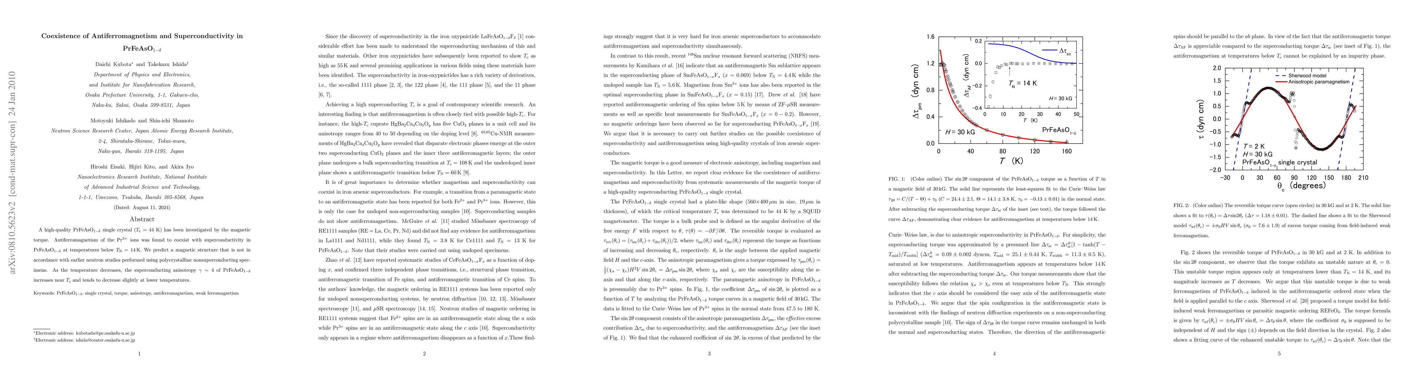 The research examines PrFeAsO$_{1-delta}$ single crystal with $T_{ m c}=44$ K, revealing coexistence of antiferromagnetism of Pr$^{3+}$ ions and superconductivity below $T_mathrm{N}=14$ K. The study predicts a unique magnetic structure, contrasting earlier polycrystalline findings, and notes superconducting anisotropy changes with temperature.