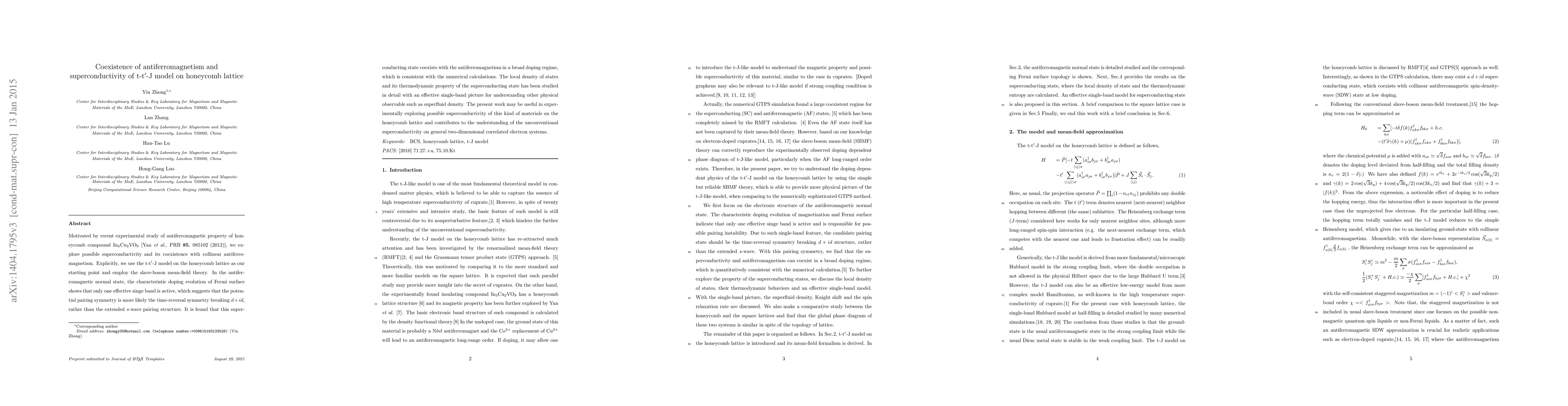 This paper investigates the coexistence of antiferromagnetism and unconventional superconductivity in a t-t$^\prime$-J model on a honeycomb lattice, using the slave-boson mean-field theory. The study finds that the $d+id$ pairing symmetry emerges in a single active band, and this superconducting state can coexist with antiferromagnetism over a broad doping range, offering insights into the physics of two-dimensional correlated electron systems.