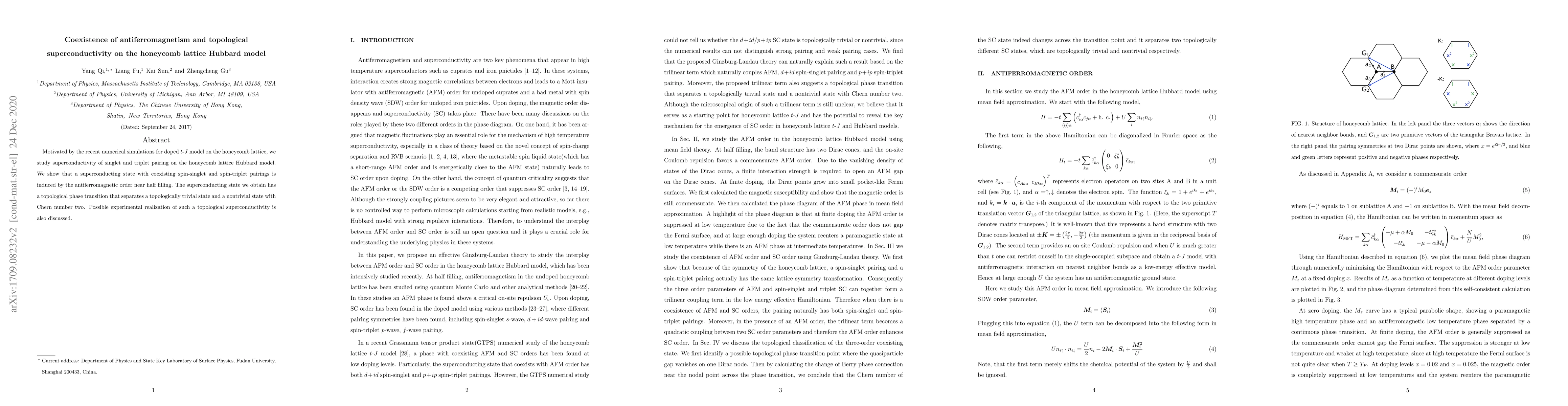 Summary: This paper investigates the coexistence of antiferromagnetism and topological superconductivity in the honeycomb lattice Hubbard model, revealing a superconducting state with both spin-singlet and spin-triplet pairings induced by antiferromagnetic order, and identifying a topological phase transition with a Chern number of two. Potential experimental realizations of this topological superconductivity are also considered.