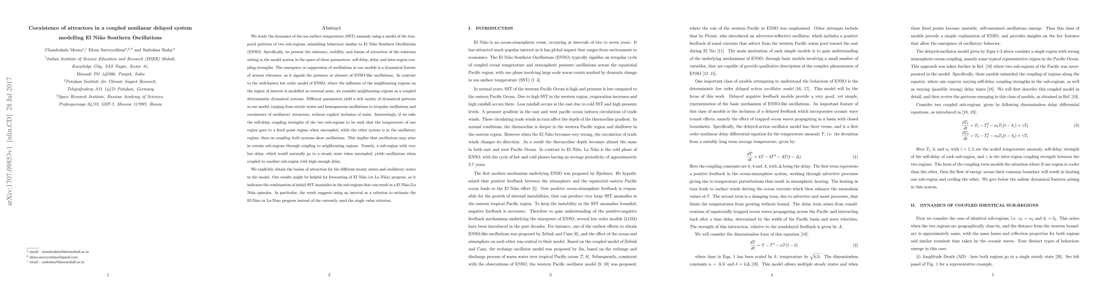 This paper investigates the dynamics of a coupled nonlinear delayed system modeling El Niño Southern Oscillations, focusing on the coexistence of attractors and their stability. It reveals diverse dynamical patterns, including steady states and oscillatory regimes, and suggests a new interval-based criterion for forecasting El Niño/La Niña episodes.